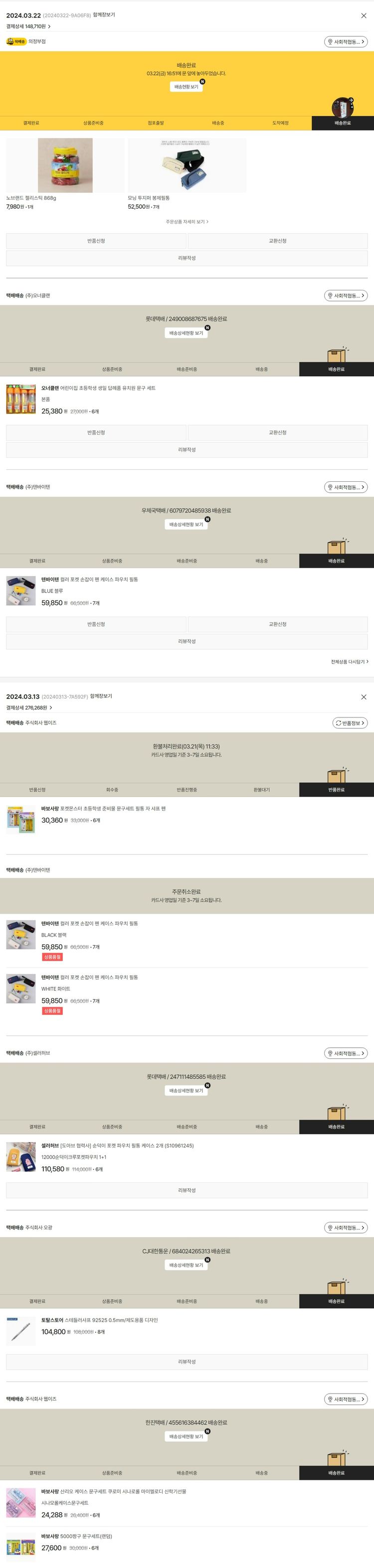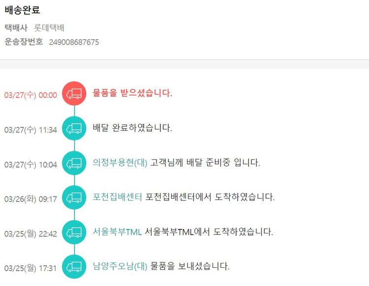 물품배송비 12,000원, 가격상승분 18원, 100원 미만 지원금 60원, 기타 사업비는 행복나눔재단이 부담했습니다. (기부후기 발송시점에 최종 업데이트 됩니다.) 주문 건 중 품절 건 발생하여 2024. 03. 22. 재주문했습니다. 실제 쇼핑몰에서 확인되는 배송현황을 캡처한 내용입니다. 실시간 자료와는 차이가 있을 수 있습니다.