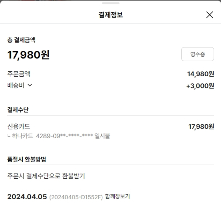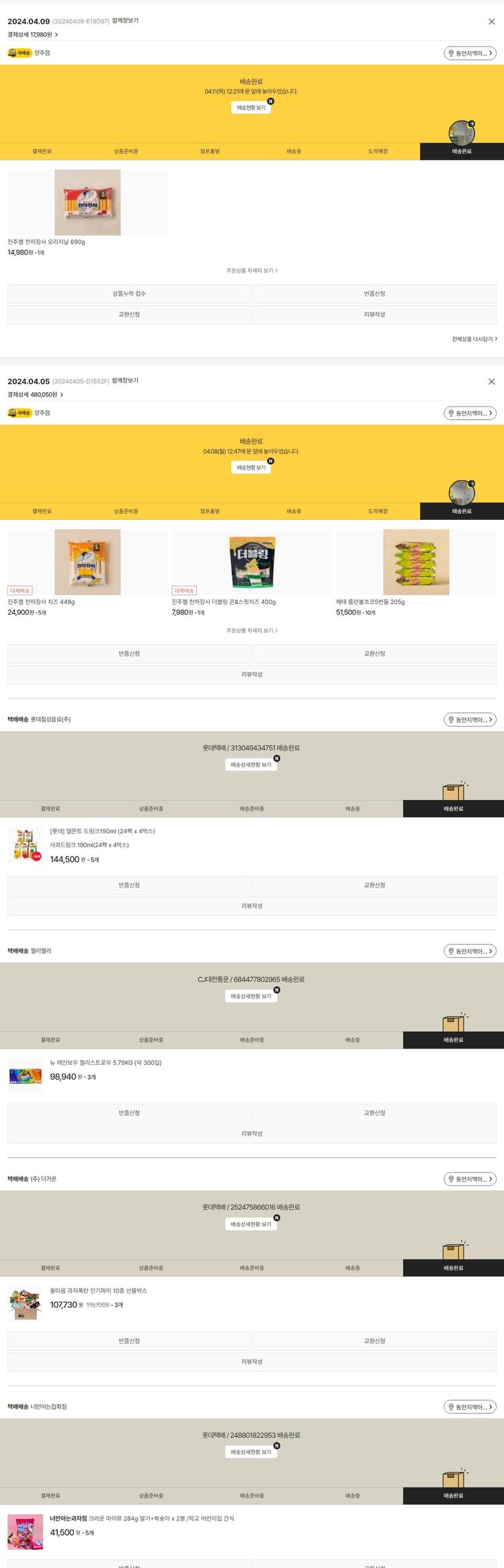 물품배송비 6,000원, 가격상승분 1,224원, 100원 미만 지원금 6원, 결제 수수료 13,263원, 기타 사업비는 행복나눔재단이 부담했습니다. (기부후기 발송시점에 최종 업데이트 됩니다.) 주문 건 중 품절로 인해 차액 환불된 물품이 있어 2024. 04. 09. 재주문하였습니다. 실제 쇼핑몰에서 확인되는 배송현황을 캡처한 내용입니다. 실시간 자료와는 차이가 있을 수 있습니다.