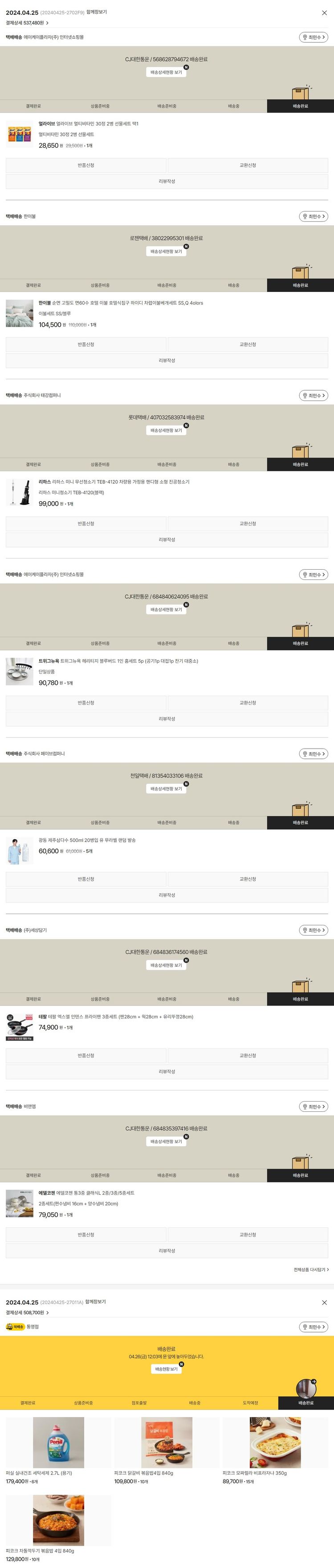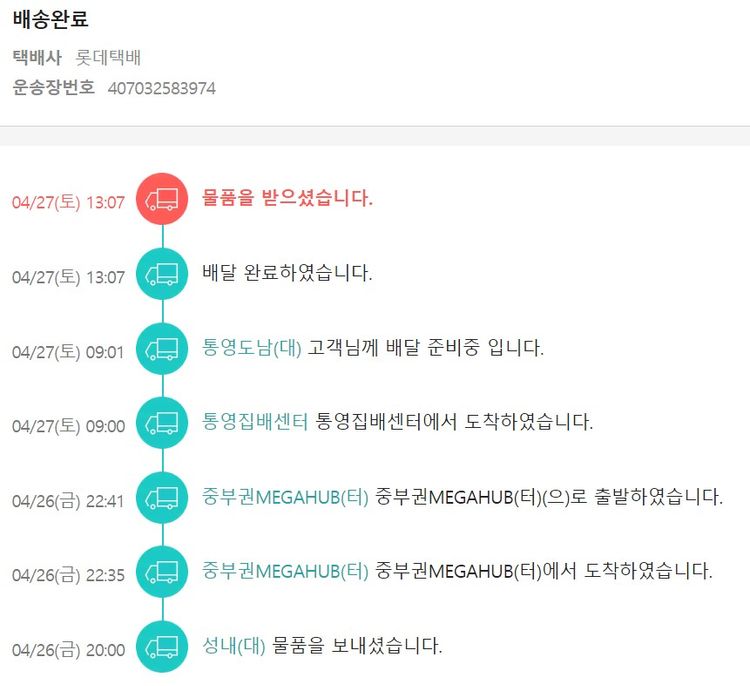 기부자님이 사용한 기부포인트 20,500원, 가격상승분 570원, 100원 미만 지원금 10원, 결제 수수료 31,580원, 기타 사업비는 행복나눔재단이 부담했습니다. (기부후기 발송시점에 최종 업데이트 됩니다.) 실제 쇼핑몰에서 확인되는 배송현황을 캡처한 내용입니다. 실시간 자료와는 차이가 있을 수 있습니다.