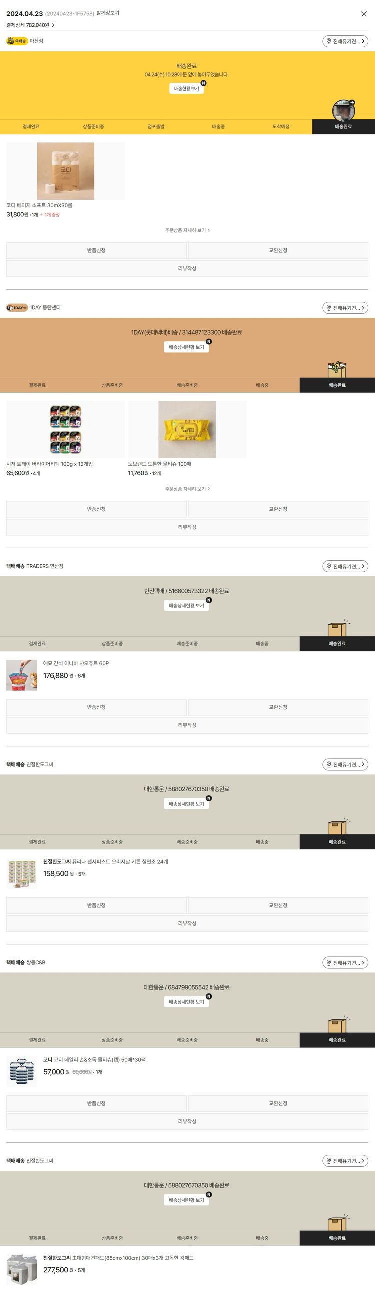 기부자님이 사용한 기부포인트 38,000원, 물품배송비 3,000원, 가격상승분 920원, 100원 미만 지원금 20원, 결제 수수료 19,012원, 기타 사업비는 행복나눔재단이 부담했습니다. (기부후기 발송시점에 최종 업데이트 됩니다.) 기존 장바구니 물품 중 품절 물품이 있어 담당 선생님과 조율하여 주문 진행했습니다. 실제 쇼핑몰에서 확인되는 배송현황을 캡처한 내용입니다. 실시간 자료와는 차이가 있을 수 있습니다.