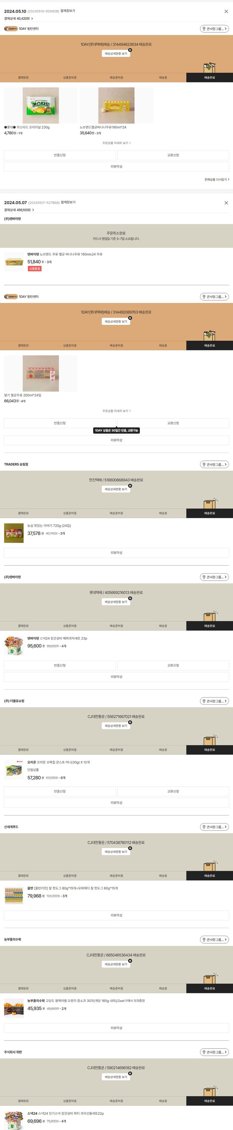 기부자님이 사용한 기부포인트 4,100원, 물품배송비 4,000원, 가격상승분 140원, 100원 미만 지원금 80원, 결제 수수료 14,051원, 기타 사업비는 행복나눔재단이 부담했습니다. (기부후기 발송시점에 최종 업데이트 됩니다.) 주문 건 중 품절 건 발생하여 2024. 05. 10. 재주문했습니다. 실제 쇼핑몰에서 확인되는 배송현황을 캡처한 내용입니다. 실시간 자료와는 차이가 있을 수 있습니다.