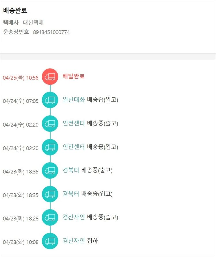 기부자님이 사용한 기부포인트 4,500원, 물품배송비 5,500원, 결제 수수료 13,611원, 기타 사업비는 행복나눔재단이 부담했습니다. (기부후기 발송시점에 최종 업데이트 됩니다.) 실제 쇼핑몰에서 확인되는 배송현황을 캡처한 내용입니다. 실시간 자료와는 차이가 있을 수 있습니다.