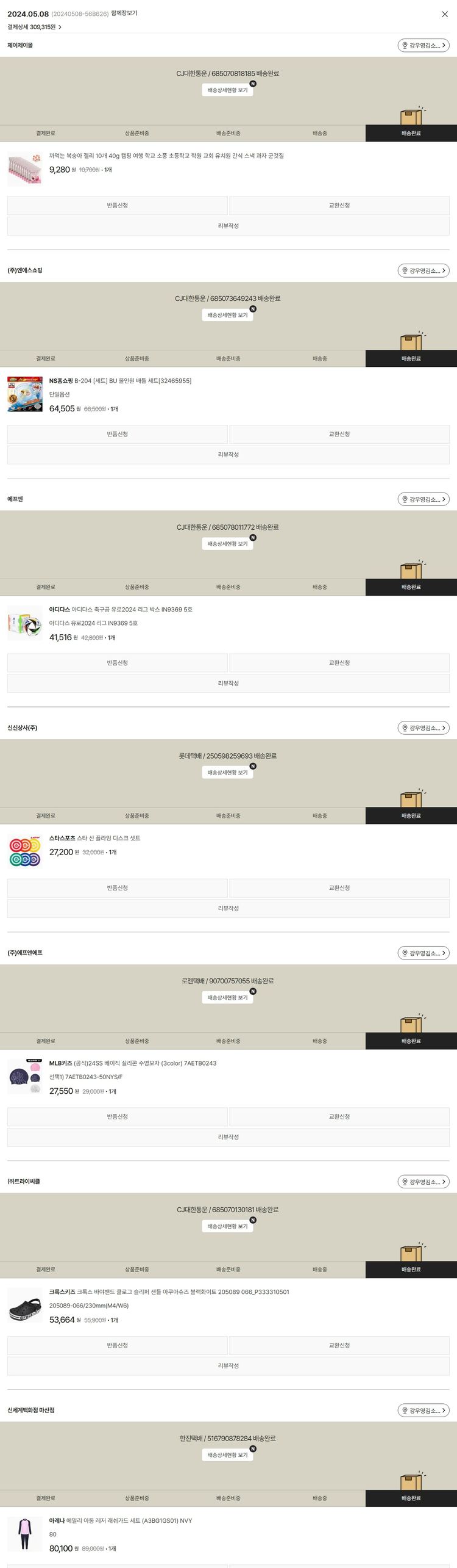 기부자님이 사용한 기부포인트 1,000원, 물품배송비 5,500원, 가격상승분 64원, 100원 미만 지원금 51원, 결제 수수료 9,762원, 기타 사업비는 행복나눔재단이 부담했습니다. (기부후기 발송시점에 최종 업데이트 됩니다.) 실제 쇼핑몰에서 확인되는 배송현황을 캡처한 내용입니다. 실시간 자료와는 차이가 있을 수 있습니다.