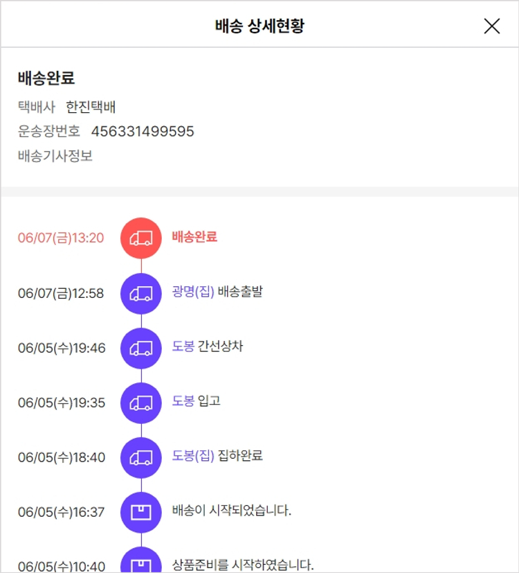 실제 쇼핑몰에서 확인되는 배송현황을 캡처한 내용입니다. 실시간 자료와는 차이가 있을 수 있습니다.