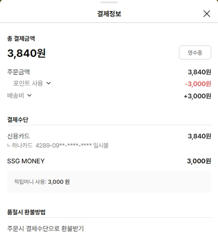 기부자님이 사용한 기부포인트 3,000원, 물품배송비 5,500원, 가격상승분 840원, 100원 미만 지원금 48원, SSG 머니 3,000포인트, 결제 수수료 10,025원, 기타 사업비는 행복나눔재단이 부담했습니다. (기부후기 발송시점에 최종 업데이트 됩니다.) 실제 쇼핑몰에서 확인되는 배송현황을 캡처한 내용입니다. 실시간 자료와는 차이가 있을 수 있습니다.