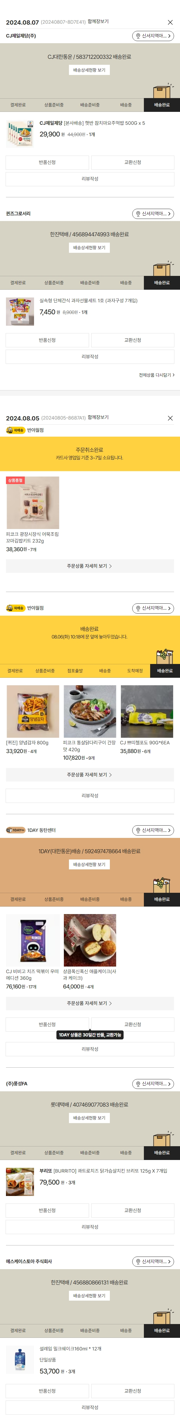 기부자님이 사용한 기부포인트 2,100원, 물품배송비 3,000원, 가격상승분 1,090원, 100원 미만 지원금 40원, 결제 수수료 10,438원, 기타 사업비는 행복나눔재단이 부담했습니다. (기부후기 발송시점에 최종 업데이트 됩니다.) 주문 건 중 품절 건 발생하여 2024. 08. 07. 재주문했습니다. 실제 쇼핑몰에서 확인되는 배송현황을 캡처한 내용입니다. 실시간 자료와는 차이가 있을 수 있습니다.