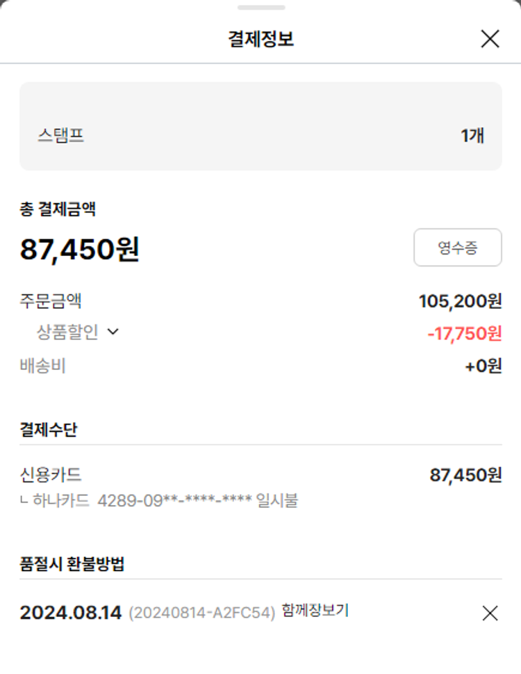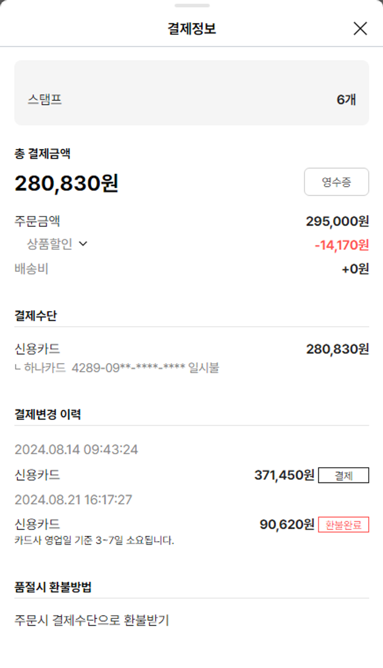 기부자님이 사용한 기부포인트 5,000원, 가격상승분 420원, 100원 미만 지원금 60원, 결제 수수료 8,434원, 기타 사업비는 행복나눔재단이 부담했습니다. (기부후기 발송시점에 최종 업데이트 됩니다.) 주문 건 중 품절 건 발생하여 2024.08.28. 재주문했습니다. 실제 쇼핑몰에서 확인되는 배송현황을 캡처한 내용입니다. 실시간 자료와는 차이가 있을 수 있습니다.