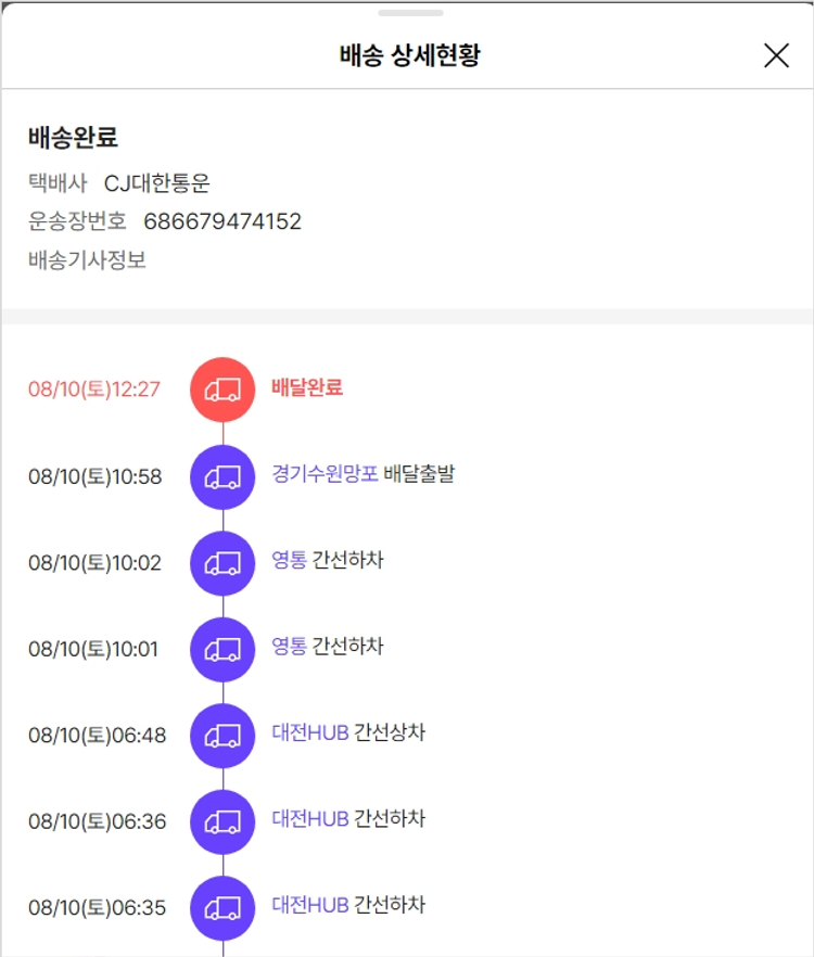 기부자님이 사용한 기부포인트 2,500원, 물품배송비 9,000원, 가격상승분 430원, 결제 수수료 19,163원, 기타 사업비는 행복나눔재단이 부담했습니다. (기부후기 발송시점에 최종 업데이트 됩니다.) 실제 쇼핑몰에서 확인되는 배송현황을 캡처한 내용입니다. 실시간 자료와는 차이가 있을 수 있습니다.