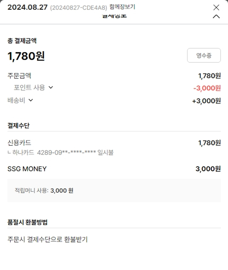기부자님이 사용한 기부포인트 6,000원, 가격상승분 1,280원, 100원 미만 지원금 50원, SSG 머니 3,000포인트, 결제 수수료 14,134원, 기타 사업비는 행복나눔재단이 부담했습니다. (기부후기 발송시점에 최종 업데이트 됩니다.) 주문 건 중 품절 건 발생하여 2024.08.30. 재주문했습니다. 실제 쇼핑몰에서 확인되는 배송현황을 캡처한 내용입니다. 실시간 자료와는 차이가 있을 수 있습니다.