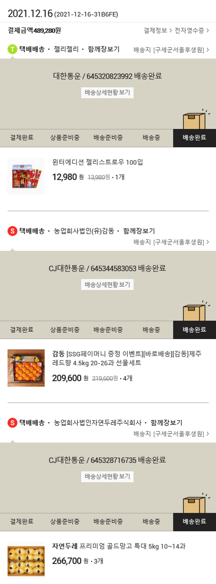 기부자님이 사용한 기부포인트 64,000원, 가격상승분 200원, 결제 수수료 13,423원, 기타 사업비는 행복나눔재단이 부담했습니다. (기부후기 발송시점에 최종 업데이트 됩니다.) 실제 쇼핑몰에서 확인되는 배송현황을 캡처한 내용입니다. 실시간 자료와는 차이가 있을 수 있습니다.