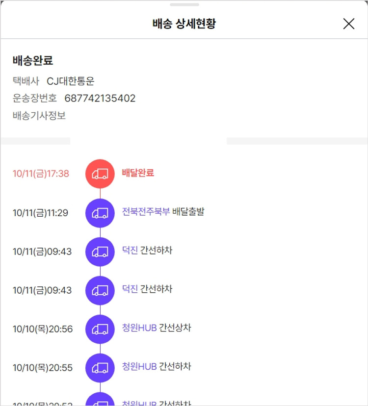 기부자님이 사용한 기부포인트 4,600원, 물품배송비 5,500원, 가격상승분 3,010원, 100원 미만 지원금 40원, 결제 수수료 13,181원, 기타 사업비는 행복나눔재단이 부담했습니다. (기부후기 발송시점에 최종 업데이트 됩니다.) 주문 건 중 품절 건 발생하여 2024-10-04 재주문했습니다. 실제 쇼핑몰에서 확인되는 배송현황을 캡처한 내용입니다. 실시간 자료와는 차이가 있을 수 있습니다.