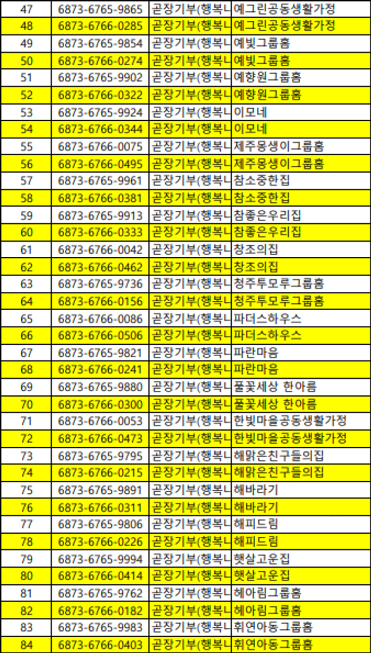 센터명, 대표 전화번호, 고유번호, 아이들 인원, 아이들 소개, 센터 소개글, 담당자 이름, 센터 이미지, 장바구니 소개글, 기부후기 이미지, 기부후기 글 | 재단이 곧장기부 서비스를 종료하는 날부터 5년까지 |