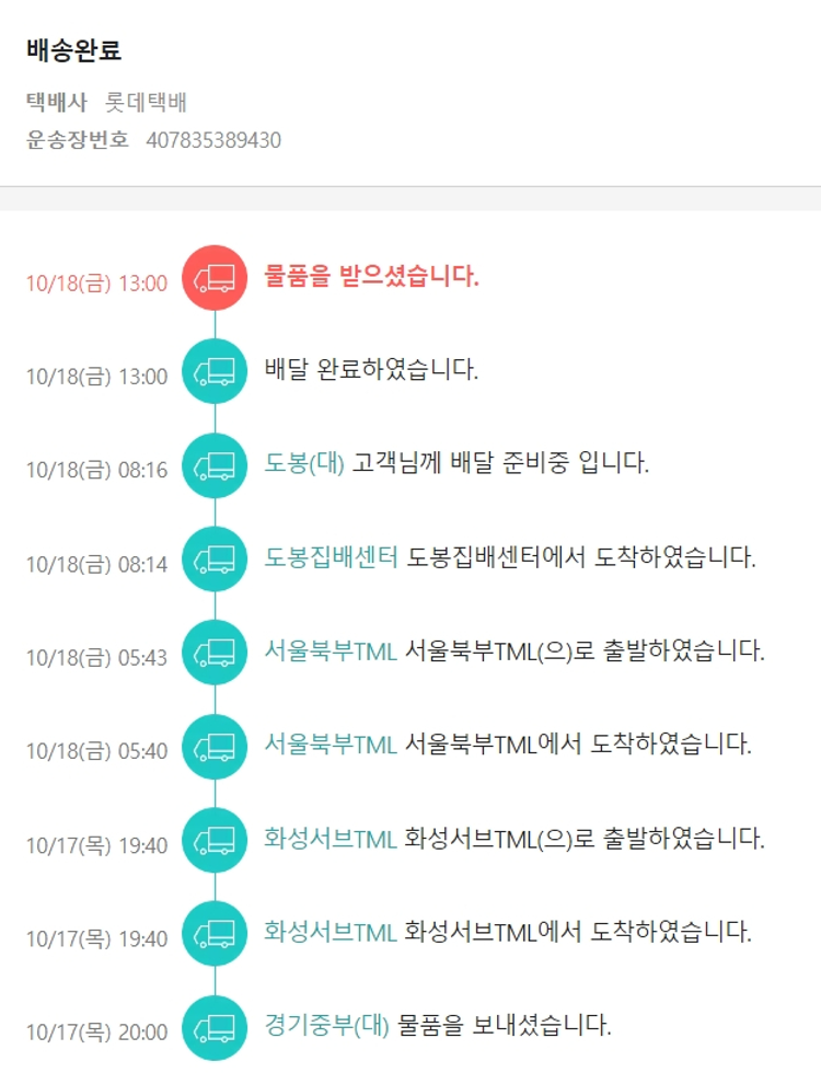 기부자님이 사용한 기부포인트 4,200원, 물품배송비 3,000원, 가격상승분 290원, 결제 수수료 13,558원, 기타 사업비는 행복나눔재단이 부담했습니다. (기부후기 발송시점에 최종 업데이트 됩니다.) 주문 건 중 품절 건 발생하여 2024-10-16 재주문했습니다. 실제 쇼핑몰에서 확인되는 배송현황을 캡처한 내용입니다. 실시간 자료와는 차이가 있을 수 있습니다.