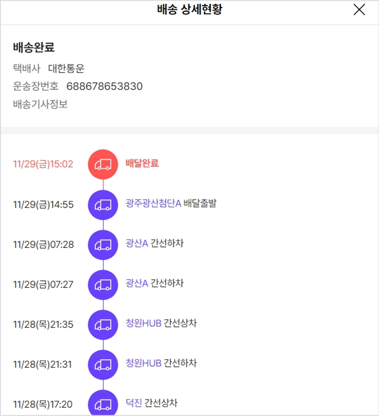 기부자님이 사용한 기부포인트 400원, 물품배송비 3,000원, 가격상승분 860원, 100원 미만 지원금 35원, 결제 수수료 10,272원, 기타 사업비는 행복나눔재단이 부담했습니다. (기부후기 발송시점에 최종 업데이트 됩니다.) 주문 건 중 품절 건 발생하여 2024-11-27 재주문했습니다. 실제 쇼핑몰에서 확인되는 배송현황을 캡처한 내용입니다. 실시간 자료와는 차이가 있을 수 있습니다.