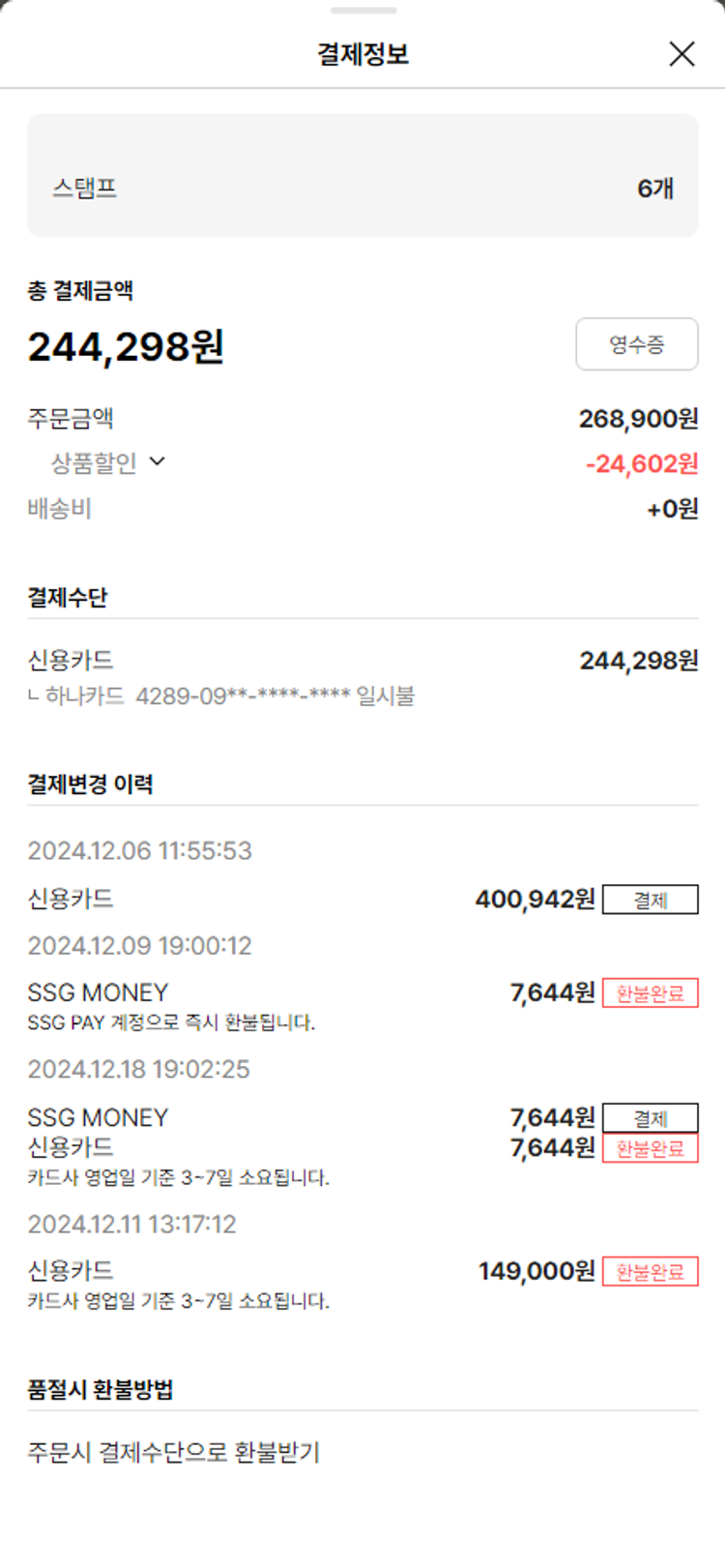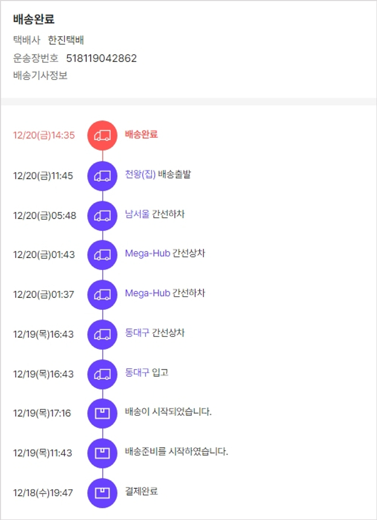 기부자님이 사용한 기부포인트 2,000원, 가격상승분 3,702원, 100원 미만 지원금 20원, 결제 수수료 13,826원, 기타 사업비는 행복나눔재단이 부담했습니다. (기부후기 발송시점에 최종 업데이트 됩니다.) 주문 건 중 품절 건 발생하여 2024-12-18 재주문했습니다. 실제 쇼핑몰에서 확인되는 배송현황을 캡처한 내용입니다. 실시간 자료와는 차이가 있을 수 있습니다.