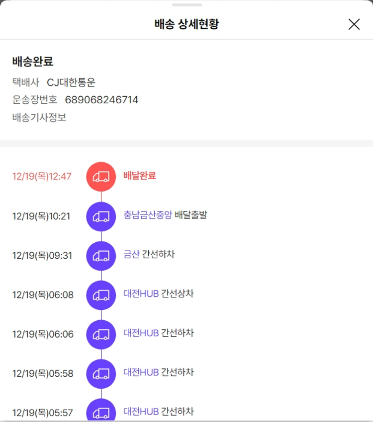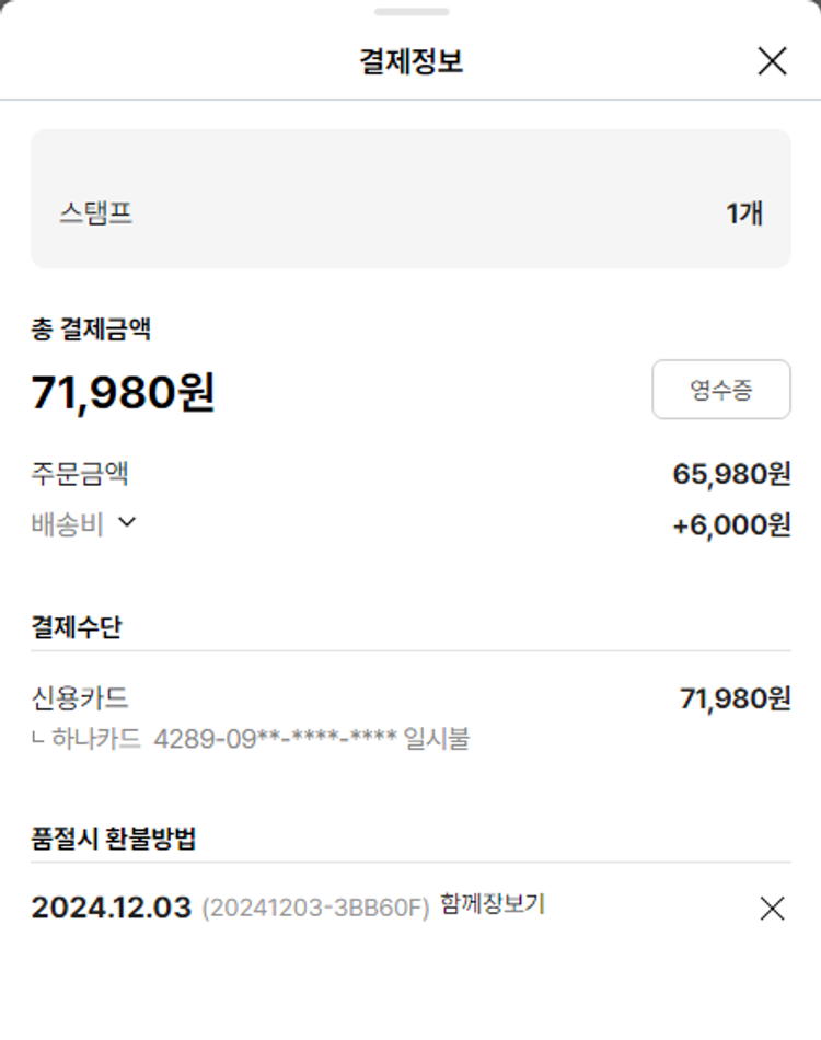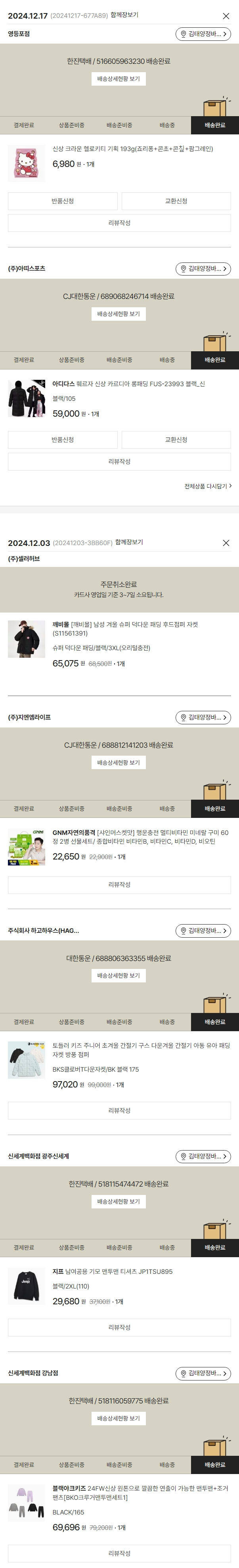 물품배송비 6,000원, 가격상승분 930원, 100원 미만 지원금 96원, 결제 수수료 7,185원, 기타 사업비는 행복나눔재단이 부담했습니다. (기부후기 발송시점에 최종 업데이트 됩니다.) 주문 건 중 품절 건 발생하여 2024-12-17 재주문했습니다. 실제 쇼핑몰에서 확인되는 배송현황을 캡처한 내용입니다. 실시간 자료와는 차이가 있을 수 있습니다.