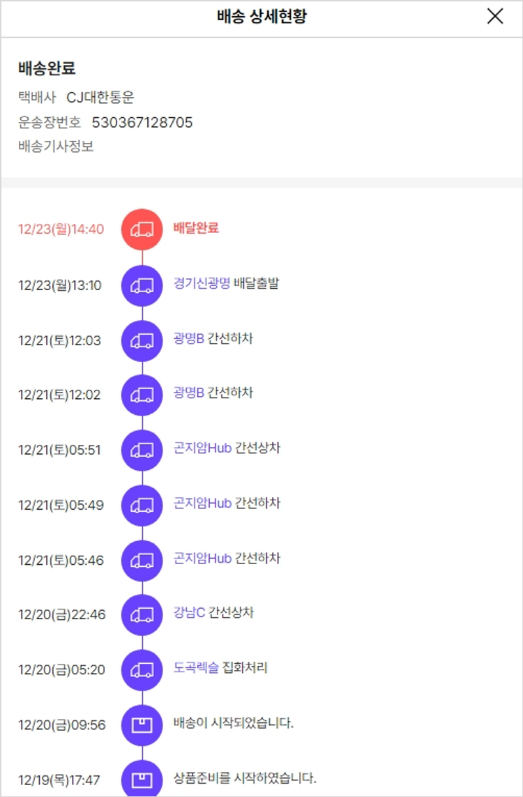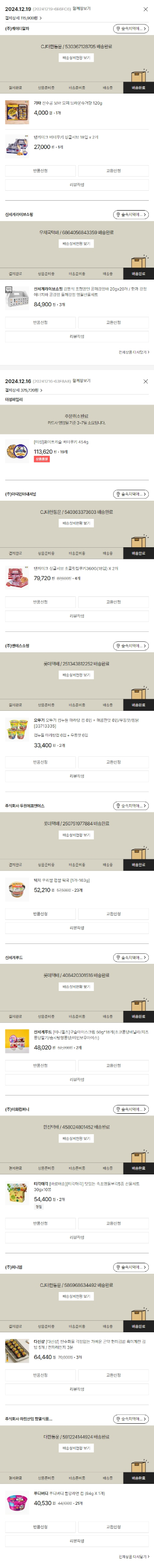 기부자님이 사용한 기부포인트 11,750원, 물품배송비 3,000원, 가격상승분 3,120원, 결제 수수료 13,516원, 기타 사업비는 행복나눔재단이 부담했습니다. (기부후기 발송시점에 최종 업데이트 됩니다.) 주문 건 중 품절 건 발생하여 2024-12-19 재주문했습니다. 실제 쇼핑몰에서 확인되는 배송현황을 캡처한 내용입니다. 실시간 자료와는 차이가 있을 수 있습니다.