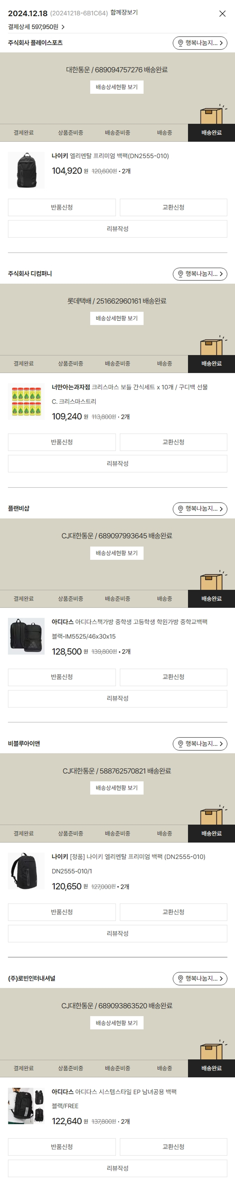 기부자님이 사용한 기부포인트 9,000원, 물품배송비 12,000원, 가격상승분 20원, 100원 미만 지원금 30원, 결제 수수료 14,595원, 기타 사업비는 행복나눔재단이 부담했습니다. (기부후기 발송시점에 최종 업데이트 됩니다.) 실제 쇼핑몰에서 확인되는 배송현황을 캡처한 내용입니다. 실시간 자료와는 차이가 있을 수 있습니다.
