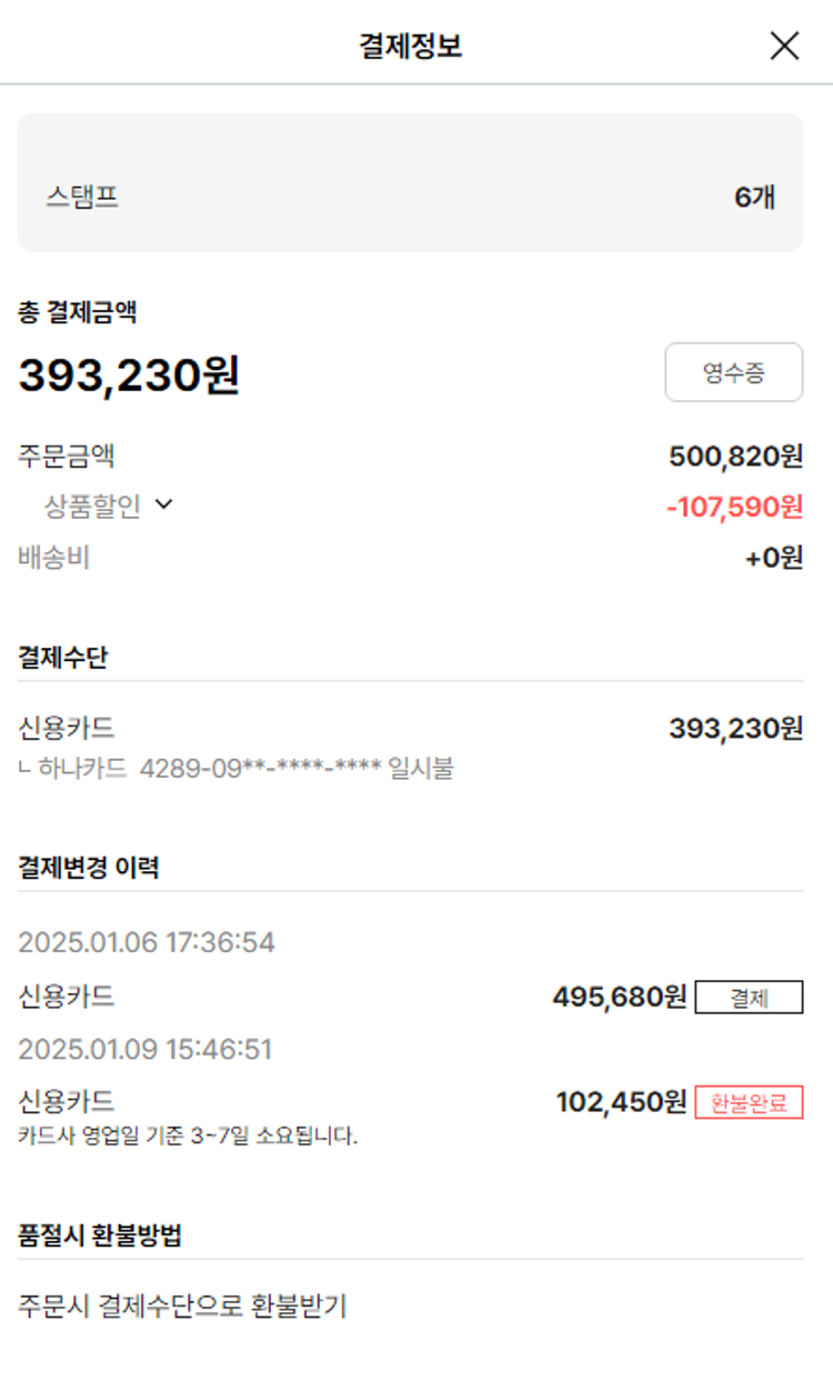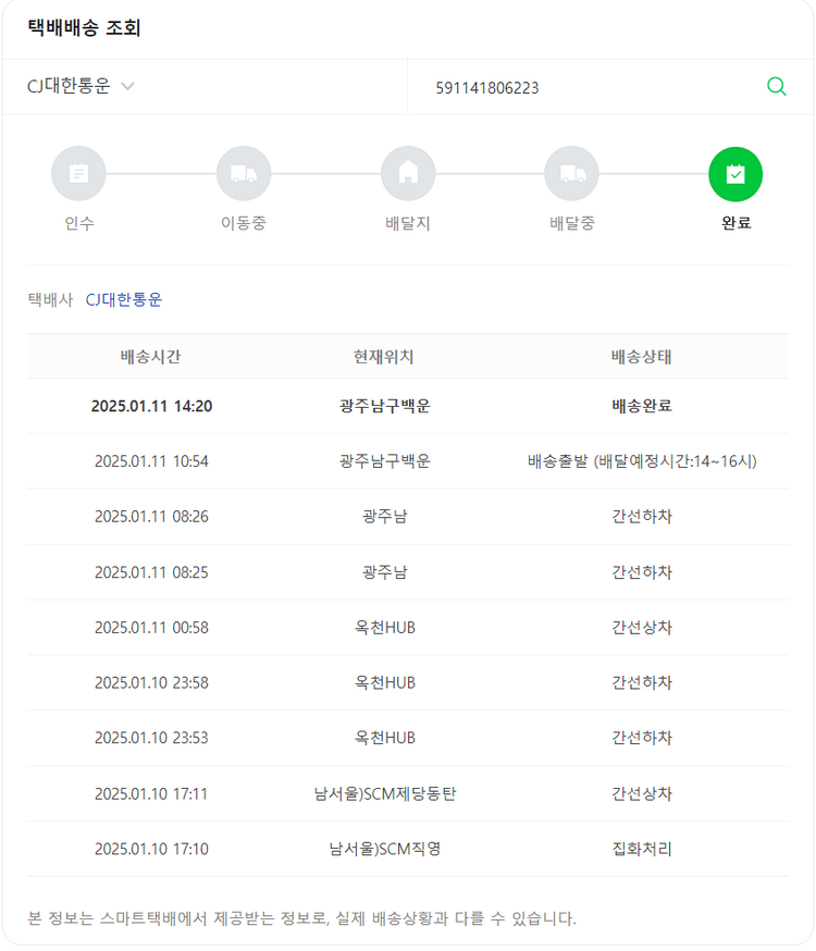 기부자님이 사용한 기부포인트 5,900원, 가격상승분 3,650원, 100원 미만 지원금 80원, 결제 수수료 13,650원, 기타 사업비는 행복나눔재단이 부담했습니다. (기부후기 발송시점에 최종 업데이트 됩니다.) 품절 건 있어 2025-01-10 재주문하였습니다. 실제 쇼핑몰에서 확인되는 배송현황을 캡처한 내용입니다. 실시간 자료와는 차이가 있을 수 있습니다.