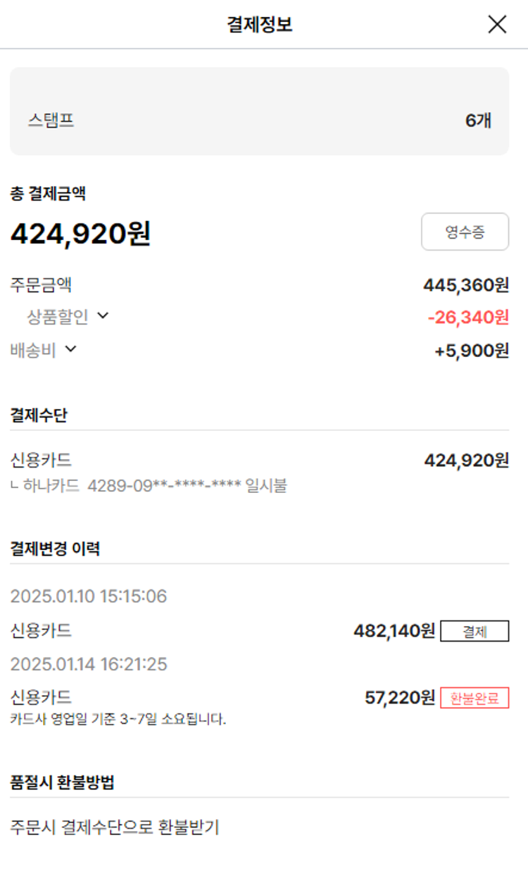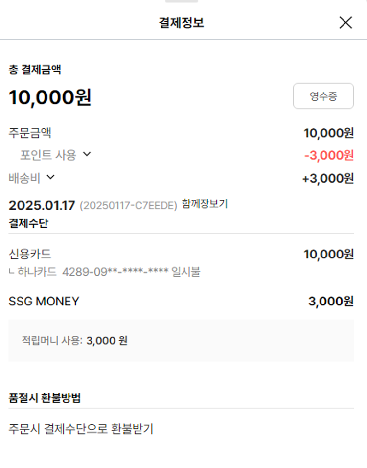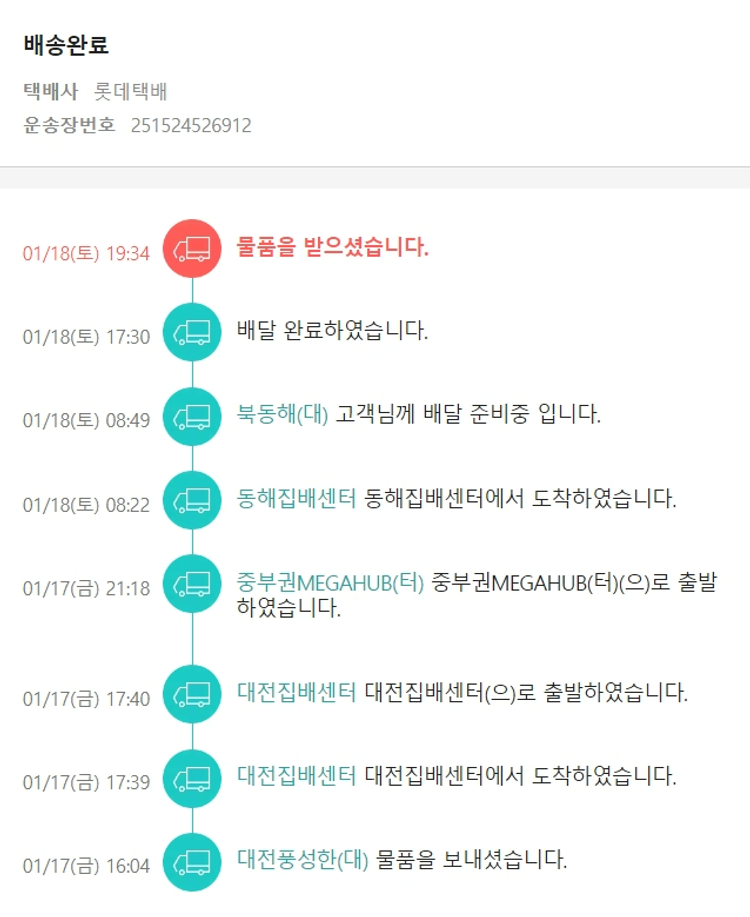 기부자님이 사용한 기부포인트 3,550원, 물품배송비 11,900원, 가격상승분 4,680원, 100원 미만 지원금 20원, SSG 머니 3,000포인트, 결제 수수료 12,051원, 기타 사업비는 행복나눔재단이 부담했습니다. (기부후기 발송시점에 최종 업데이트 됩니다.) 주문 상품 중 품절 건 발생하여 2025-01-17 재주문하였습니다. 실제 쇼핑몰에서 확인되는 배송현황을 캡처한 내용입니다. 실시간 자료와는 차이가 있을 수 있습니다.