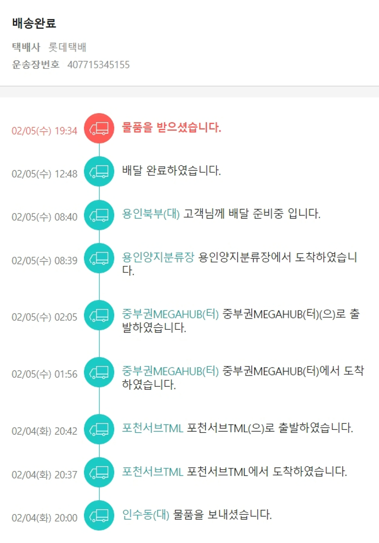 기부자님이 사용한 기부포인트 5,600원, 물품배송비 6,000원, 가격상승분 660원, 100원 미만 지원금 20원, 결제 수수료 13,544원, 기타 사업비는 행복나눔재단이 부담했습니다. (기부후기 발송시점에 최종 업데이트 됩니다.) 주문 상품 중 품절 발생하여 2025-02-03 재주문하였습니다. 실제 쇼핑몰에서 확인되는 배송현황을 캡처한 내용입니다. 실시간 자료와는 차이가 있을 수 있습니다.