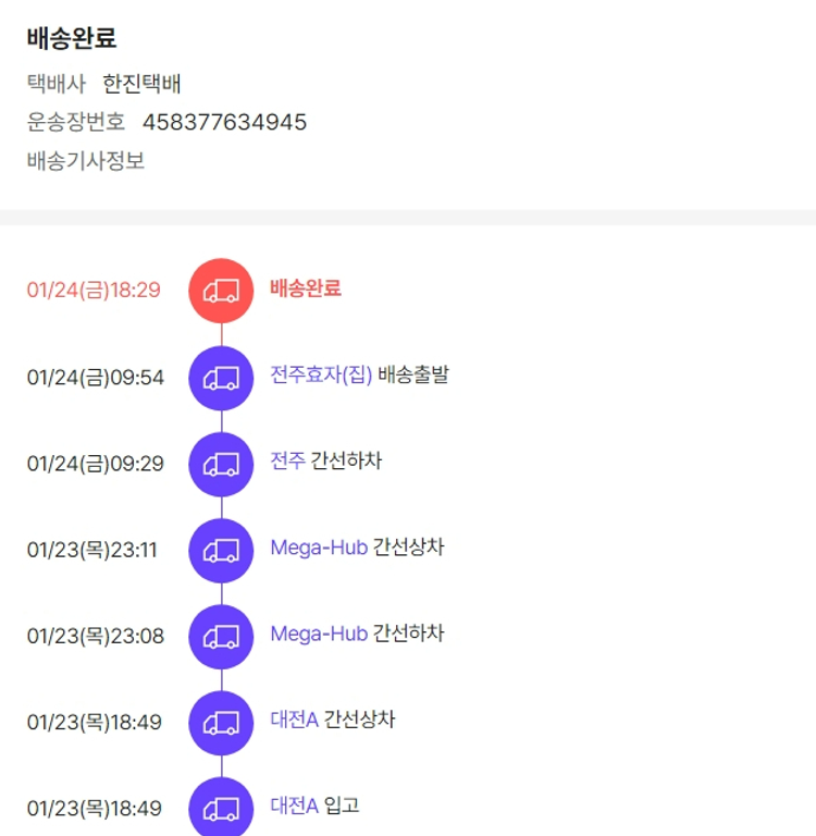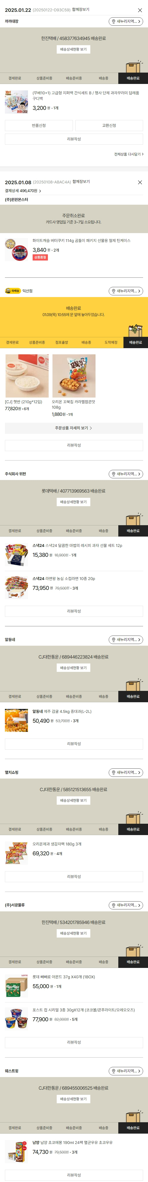 가격상승분 180원, 100원 미만 지원금 90원, 결제 수수료 12,634원, 기타 사업비는 행복나눔재단이 부담했습니다. (기부후기 발송시점에 최종 업데이트 됩니다.) 주문 상품 중 품절 건 발생하여 2025-01-22 재주문하였습니다. 실제 쇼핑몰에서 확인되는 배송현황을 캡처한 내용입니다. 실시간 자료와는 차이가 있을 수 있습니다.