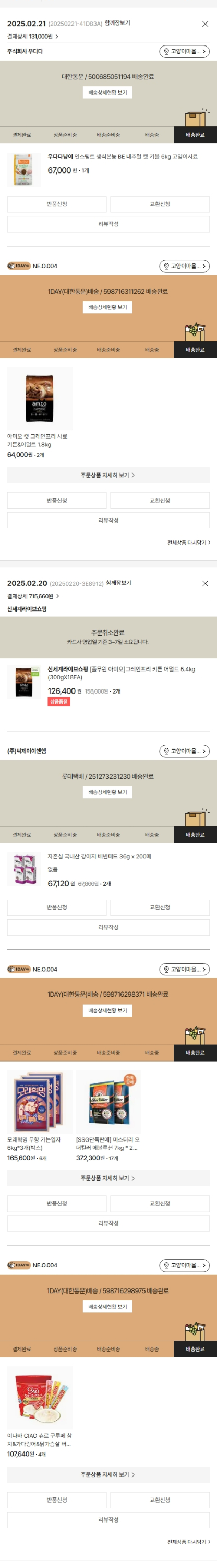 기부자님이 사용한 기부포인트 50원, 물품배송비 3,000원, 가격상승분 6,540원, 100원 미만 지원금 20원, 결제 수수료 20,343원, 기타 사업비는 행복나눔재단이 부담했습니다. (기부후기 발송시점에 최종 업데이트 됩니다.) 주문 상품 중 품절 발생하여 2025-02-21 재주문하였습니다. 실제 쇼핑몰에서 확인되는 배송현황을 캡처한 내용입니다. 실시간 자료와는 차이가 있을 수 있습니다.