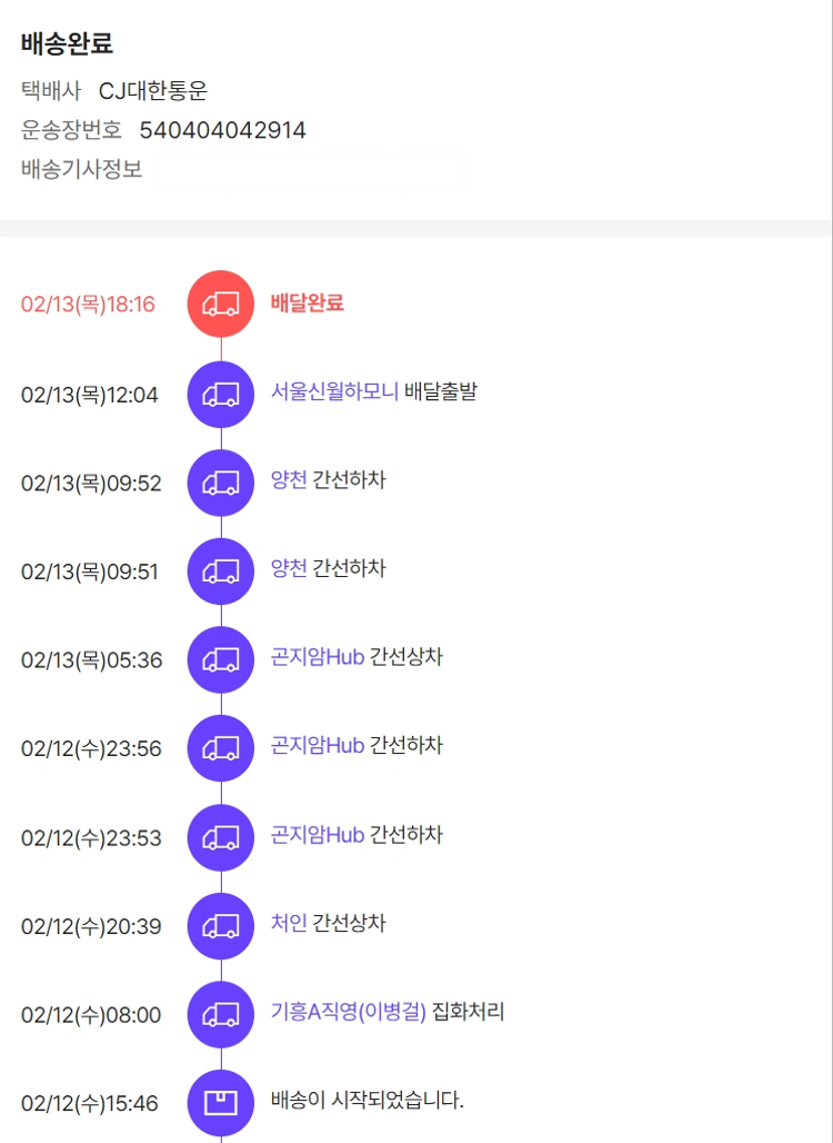 기부자님이 사용한 기부포인트 21,750원, 물품배송비 9,500원, 가격상승분 6,690원, 100원 미만 지원금 20원, 결제 수수료 12,550원, 기타 사업비는 행복나눔재단이 부담했습니다. (기부후기 발송시점에 최종 업데이트 됩니다.) 주문 상품 중 품절 발생하여 2025-02-11 재주문하였습니다. 실제 쇼핑몰에서 확인되는 배송현황을 캡처한 내용입니다. 실시간 자료와는 차이가 있을 수 있습니다.
