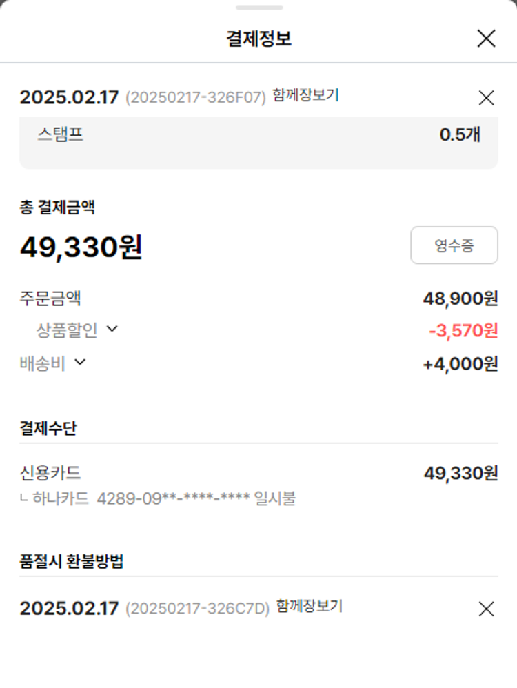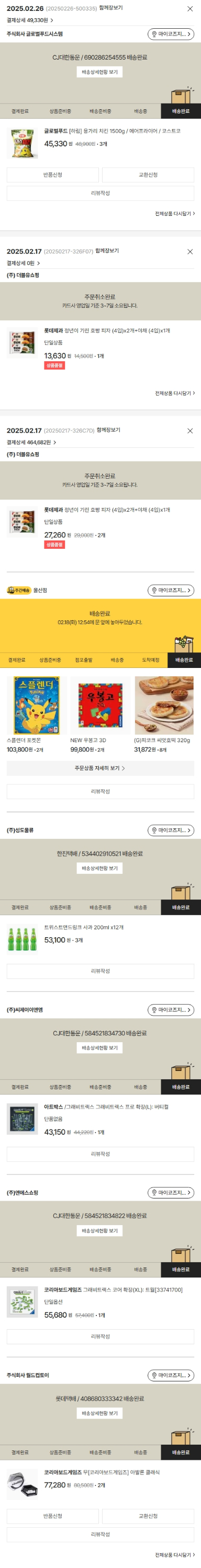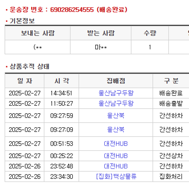 기부자님이 사용한 기부포인트 19,000원, 물품배송비 4,000원, 가격상승분 11,672원, 100원 미만 지원금 40원, 결제 수수료 11,847원, 기타 사업비는 행복나눔재단이 부담했습니다. (기부후기 발송시점에 최종 업데이트 됩니다.) 주문 상품 중 품절 발생하여 2025-02-26 재주문하였습니다. 실제 쇼핑몰에서 확인되는 배송현황을 캡처한 내용입니다. 실시간 자료와는 차이가 있을 수 있습니다.