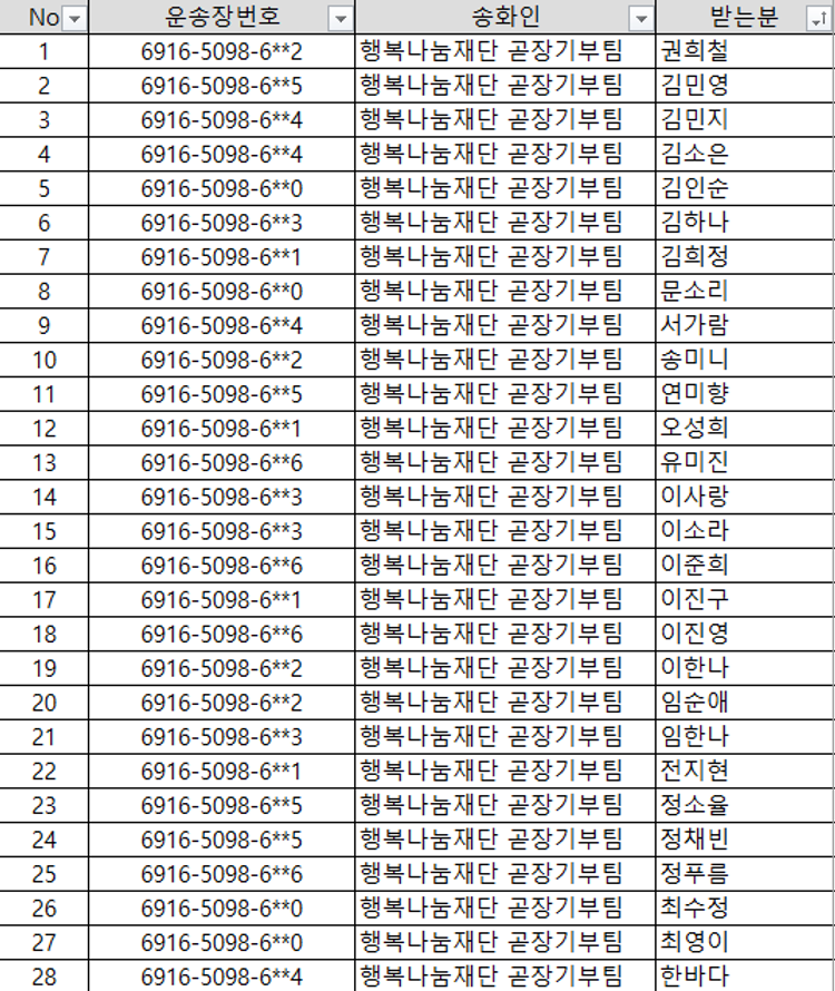 기부자님이 사용한 기부포인트 54,900원, 결제 수수료 487,588원, 기타 사업비는 행복나눔재단이 부담했습니다. (기부후기 발송시점에 최종 업데이트 됩니다.) 실제 쇼핑몰에서 확인되는 배송현황을 캡처한 내용입니다. 실시간 자료와는 차이가 있을 수 있습니다.
