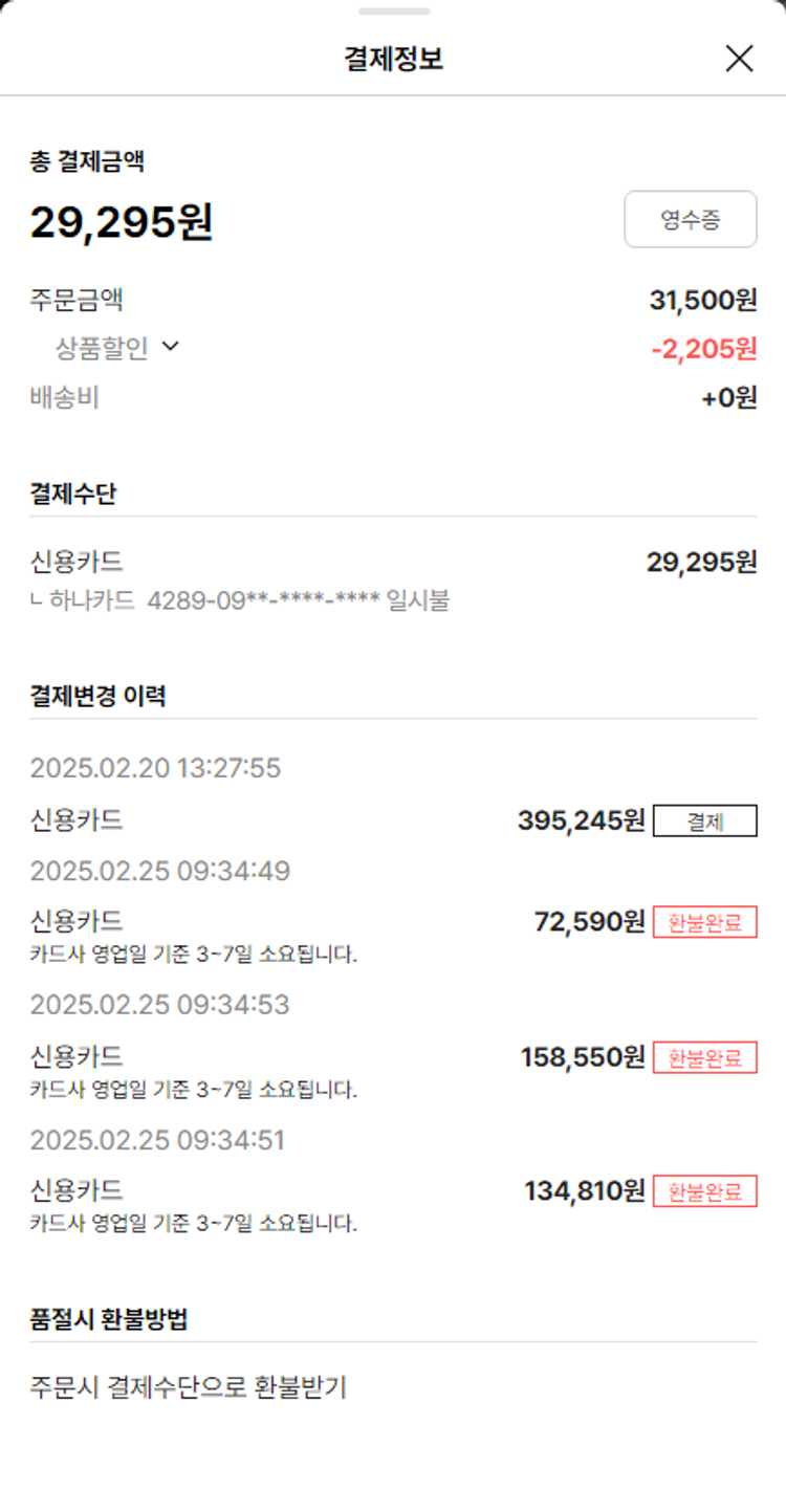 물품배송비 8,500원, 가격상승분 13,300원, 100원 미만 지원금 65원, 결제 수수료 11,918원, 기타 사업비는 행복나눔재단이 부담했습니다. (기부후기 발송시점에 최종 업데이트 됩니다.) 주문 상품 중 품절 발생하여 2025-02-26 재주문하였습니다. 실제 쇼핑몰에서 확인되는 배송현황을 캡처한 내용입니다. 실시간 자료와는 차이가 있을 수 있습니다.