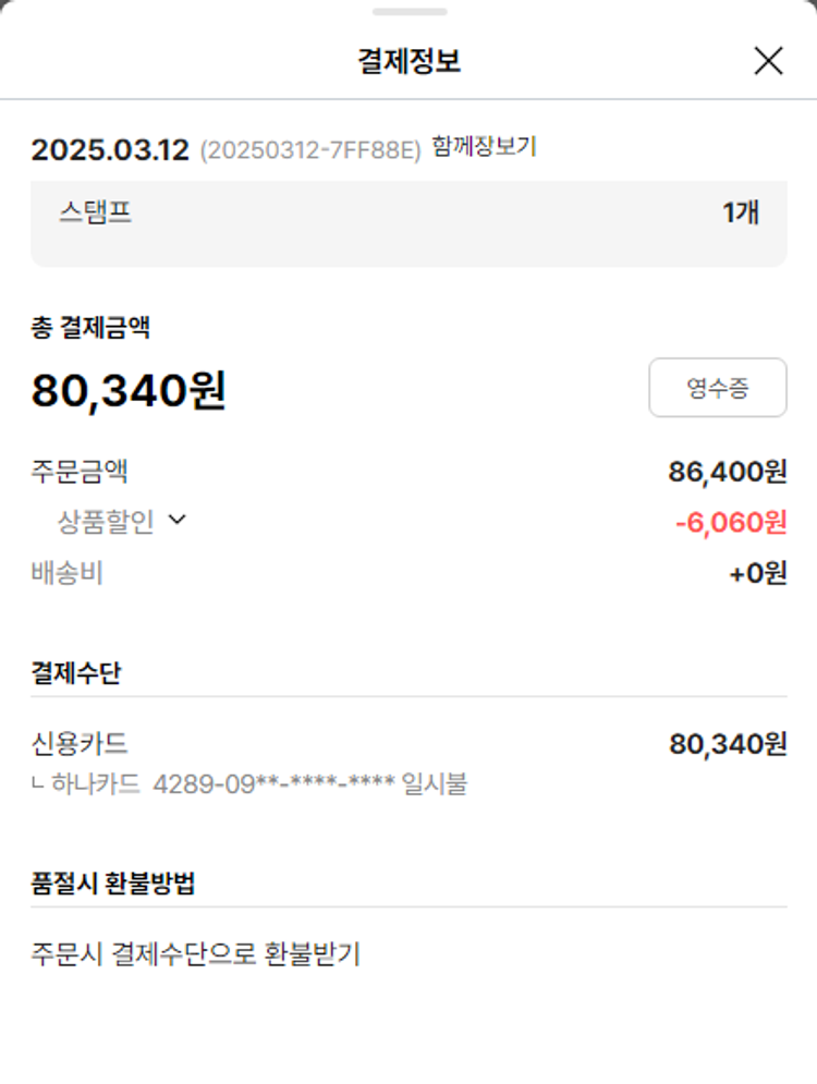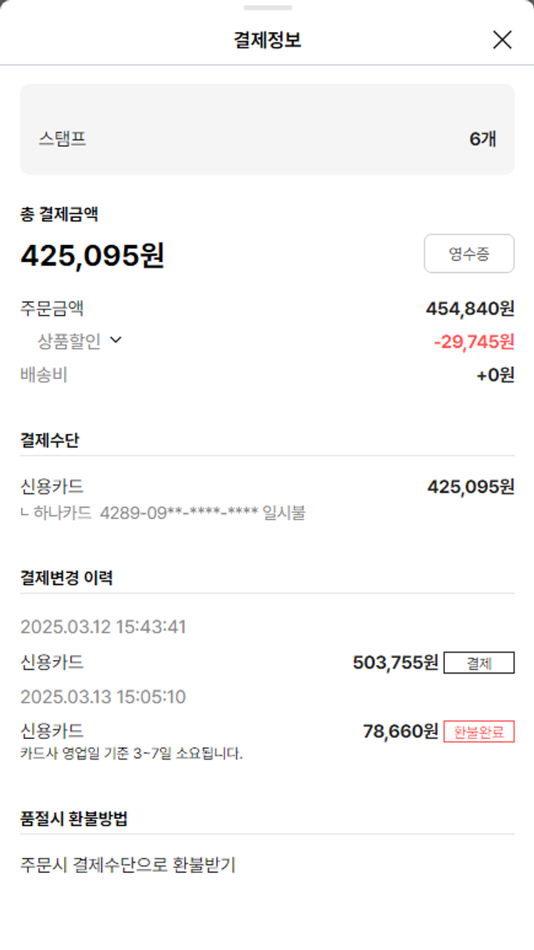 기부자님이 사용한 기부포인트 6,000원, 가격상승분 7,025원, 100원 미만 지원금 10원, 결제 수수료 12,664원, 기타 사업비는 행복나눔재단이 부담했습니다. (기부후기 발송시점에 최종 업데이트 됩니다.) 상품 주문 건 중 품절 발생하여 2025-03-14 재주문하였습니다. 실제 쇼핑몰에서 확인되는 배송현황을 캡처한 내용입니다. 실시간 자료와는 차이가 있을 수 있습니다.