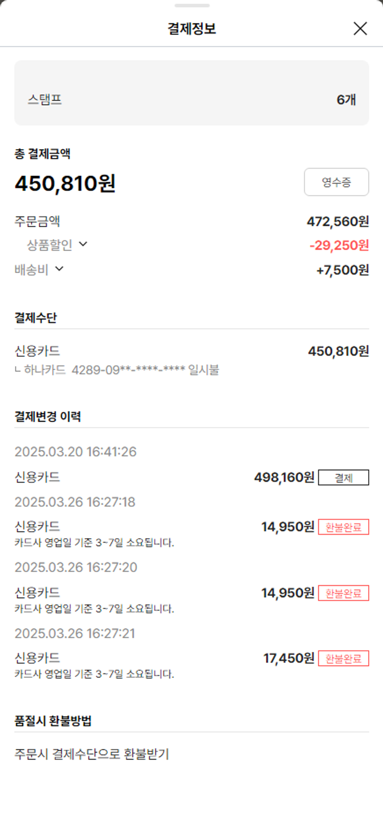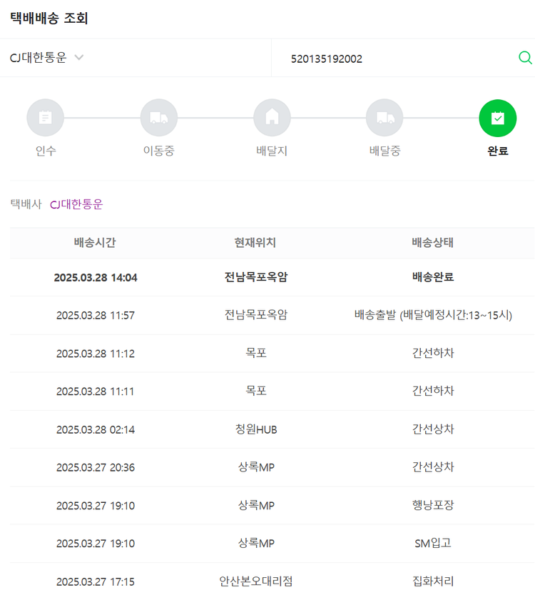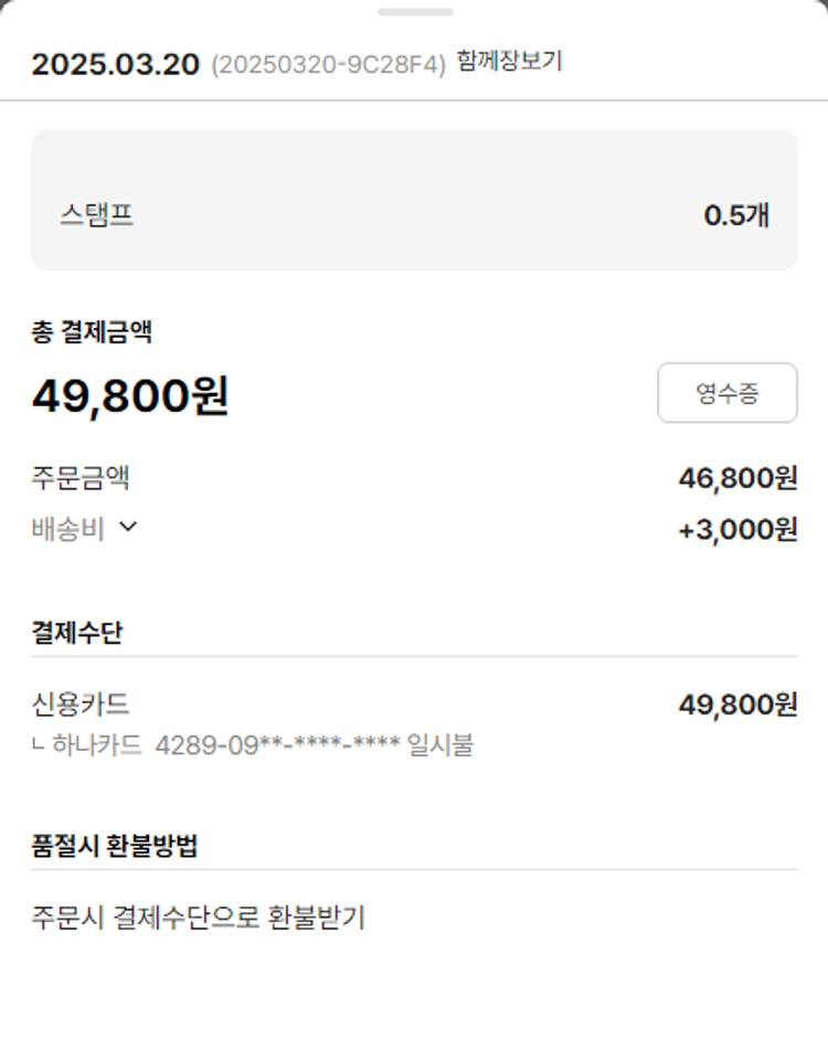 물품배송비 10,500원, 가격상승분 12,100원, 100원 미만 지원금 10원, 결제 수수료 10,491원, 기타 사업비는 행복나눔재단이 부담했습니다. (기부후기 발송시점에 최종 업데이트 됩니다.) 상품 주문 건 중 품절 발생하여 2025-03-26 재주문하였습니다. 실제 쇼핑몰에서 확인되는 배송현황을 캡처한 내용입니다. 실시간 자료와는 차이가 있을 수 있습니다.