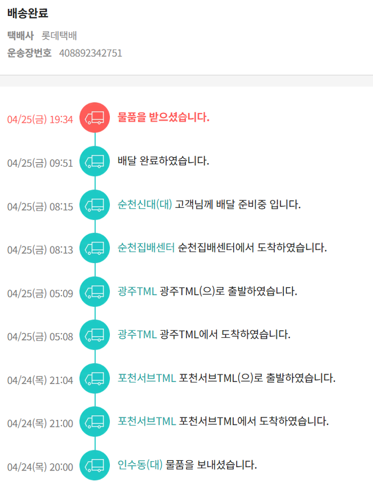 기부자님이 사용한 기부포인트 2,100원, 물품배송비 3,000원, 가격상승분 11,010원, 100원 미만 지원금 20원, 결제 수수료 11,555원, 기타 사업비는 행복나눔재단이 부담했습니다. (기부후기 발송시점에 최종 업데이트 됩니다.) 상품 주문 건 중 품절 발생하여 2025-04-23 재주문하였습니다. 실제 쇼핑몰에서 확인되는 배송현황을 캡처한 내용입니다. 실시간 자료와는 차이가 있을 수 있습니다.