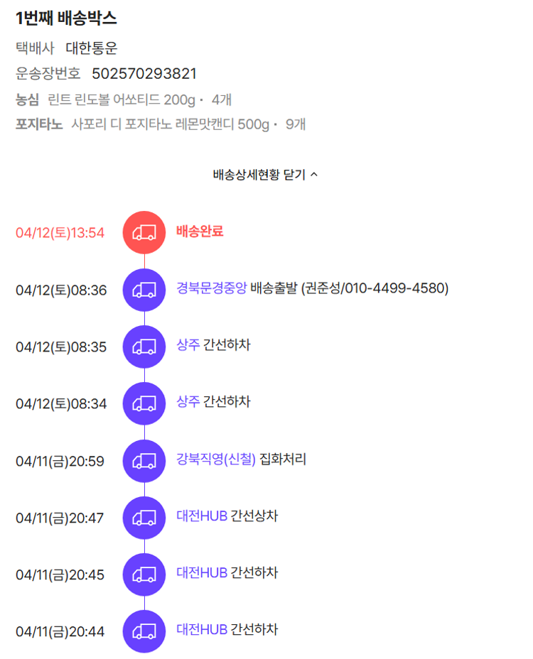 기부자님이 사용한 기부포인트 3,950원, 가격상승분 1,180원, 100원 미만 지원금 60원, 결제 수수료 11,014원, 기타 사업비는 행복나눔재단이 부담했습니다. (기부후기 발송시점에 최종 업데이트 됩니다.) 실제 쇼핑몰에서 확인되는 배송현황을 캡처한 내용입니다. 실시간 자료와는 차이가 있을 수 있습니다.