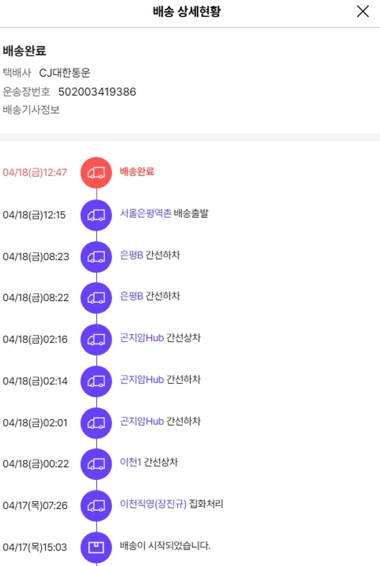 기부자님이 사용한 기부포인트 3,000원, 가격상승분 8,930원, 결제 수수료 9,781원, 기타 사업비는 행복나눔재단이 부담했습니다. (기부후기 발송시점에 최종 업데이트 됩니다.) 실제 쇼핑몰에서 확인되는 배송현황을 캡처한 내용입니다. 실시간 자료와는 차이가 있을 수 있습니다.