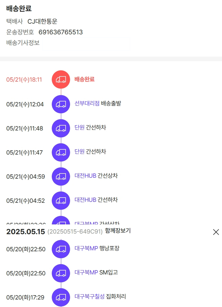 기부자님이 사용한 기부포인트 5,400원, 물품배송비 7,000원, 가격상승분 1,450원, 100원 미만 지원금 64원, 결제 수수료 14,314원, 기타 사업비는 행복나눔재단이 부담했습니다. (기부후기 발송시점에 최종 업데이트 됩니다.) 상품 주문 건 중 품절 발생하여 2025-05-19 재주문하였습니다. 실제 쇼핑몰에서 확인되는 배송현황을 캡처한 내용입니다. 실시간 자료와는 차이가 있을 수 있습니다.