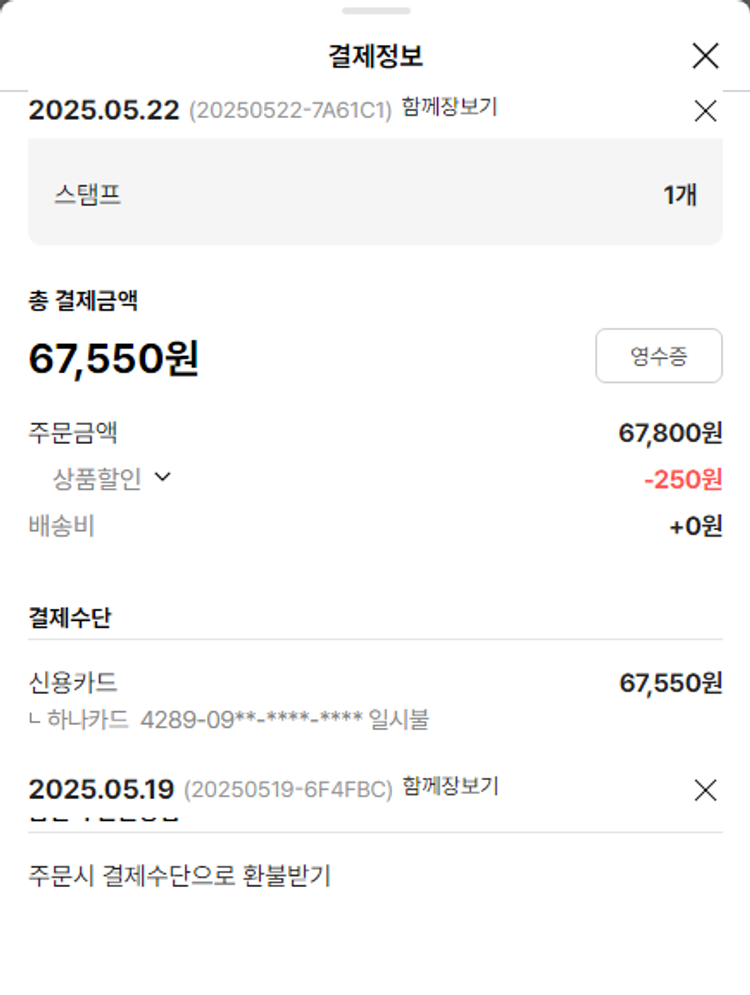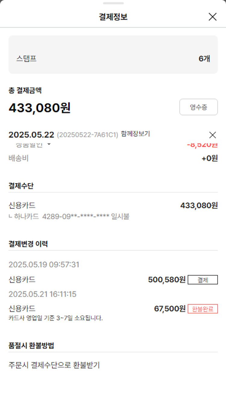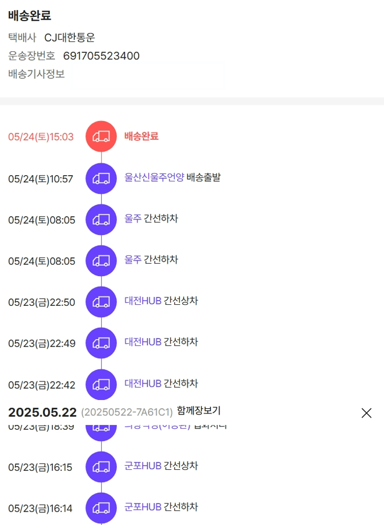 기부자님이 사용한 기부포인트 174,500원, 가격상승분 1,860원, 100원 미만 지원금 70원, 결제 수수료 9,232원, 기타 사업비는 행복나눔재단이 부담했습니다. (기부후기 발송시점에 최종 업데이트 됩니다.) 상품 주문 건 중 품절 발생하여 2025-05-23 재주문하였습니다. 실제 쇼핑몰에서 확인되는 배송현황을 캡처한 내용입니다. 실시간 자료와는 차이가 있을 수 있습니다.