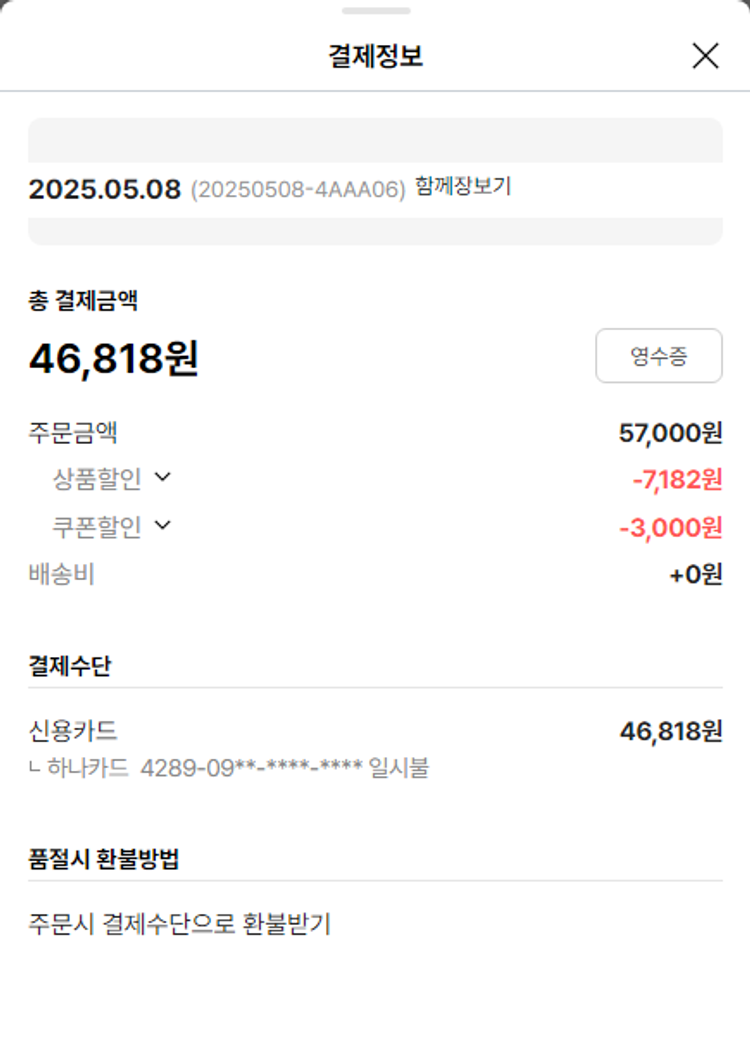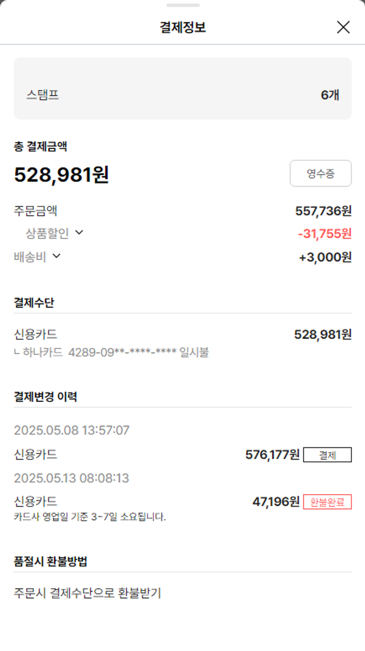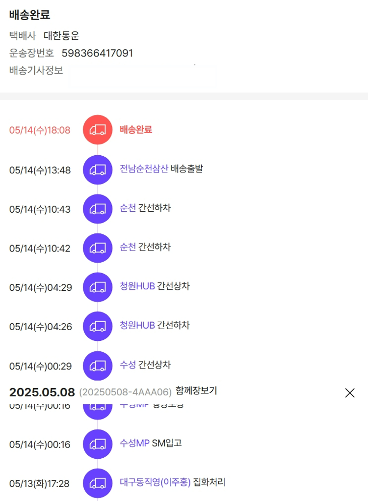 기부자님이 사용한 기부포인트 3,000원, 물품배송비 3,000원, 가격상승분 10,645원, 100원 미만 지원금 54원, 결제 수수료 11,992원, 기타 사업비는 행복나눔재단이 부담했습니다. (기부후기 발송시점에 최종 업데이트 됩니다.) 상품 주문 건 중 품절 발생하여 2025-05-13 재주문하였습니다. 실제 쇼핑몰에서 확인되는 배송현황을 캡처한 내용입니다. 실시간 자료와는 차이가 있을 수 있습니다.