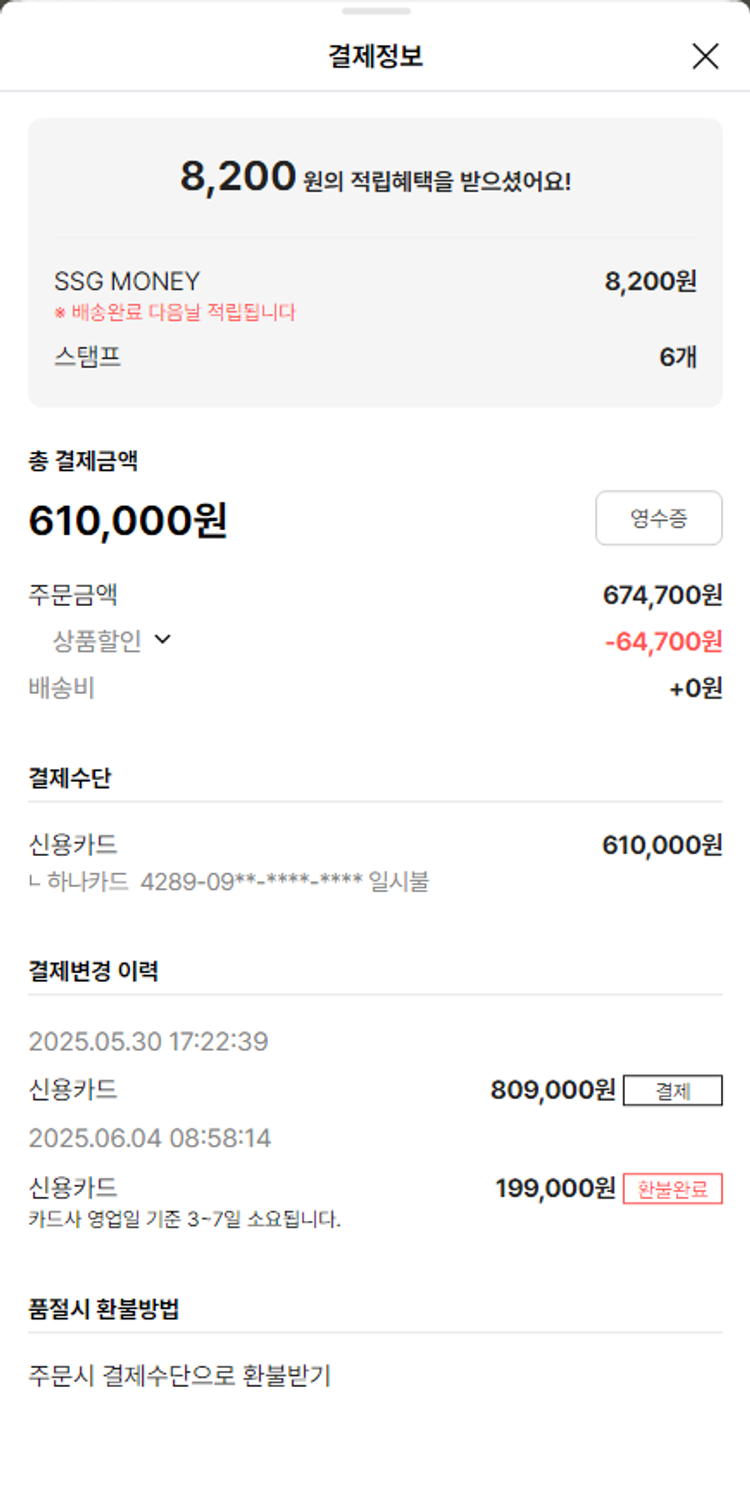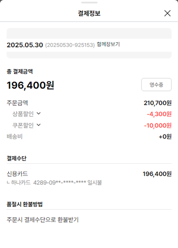 기부자님이 사용한 기부포인트 22,000원, 가격상승분 15,540원, 100원 미만 지원금 60원, 결제 수수료 18,128원, 기타 사업비는 행복나눔재단이 부담했습니다. (기부후기 발송시점에 최종 업데이트 됩니다.) 상품 주문 건 중 품절 발생하여 2025-06-04 재주문하였습니다. 실제 쇼핑몰에서 확인되는 배송현황을 캡처한 내용입니다. 실시간 자료와는 차이가 있을 수 있습니다.