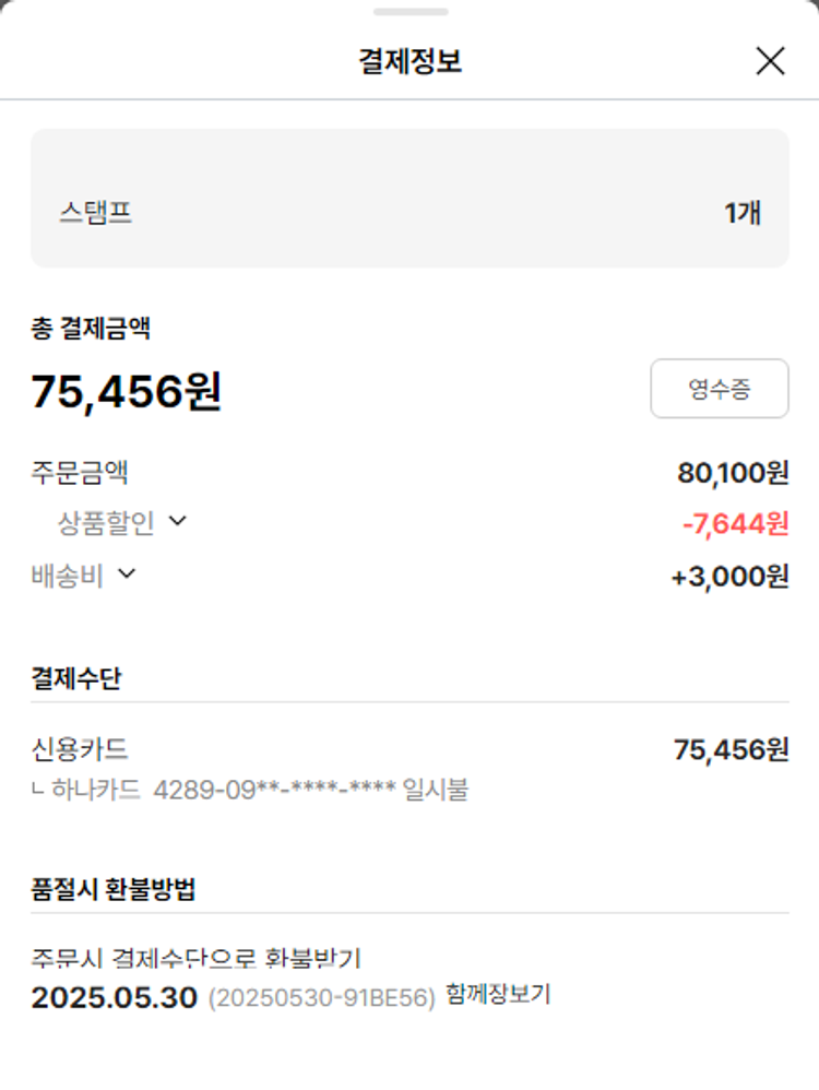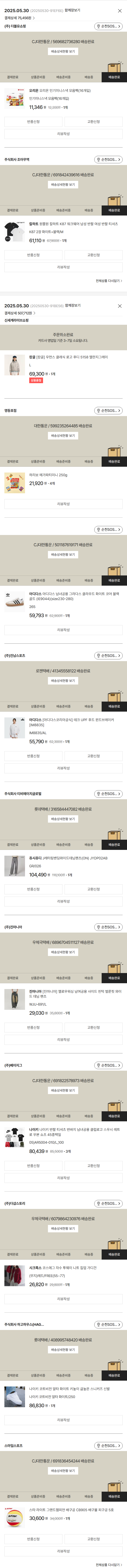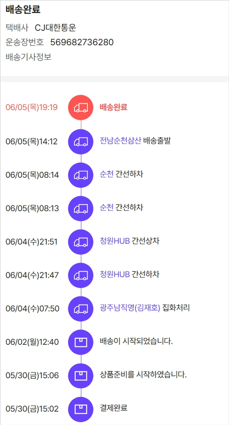 기부자님이 사용한 기부포인트 4,000원, 물품배송비 15,000원, 가격상승분 5,469원, 100원 미만 지원금 99원, 결제 수수료 17,204원, 기타 사업비는 행복나눔재단이 부담했습니다. (기부후기 발송시점에 최종 업데이트 됩니다.) 상품 주문 건 중 품절 발생하여 2025-05-30 재주문하였습니다. 실제 쇼핑몰에서 확인되는 배송현황을 캡처한 내용입니다. 실시간 자료와는 차이가 있을 수 있습니다.