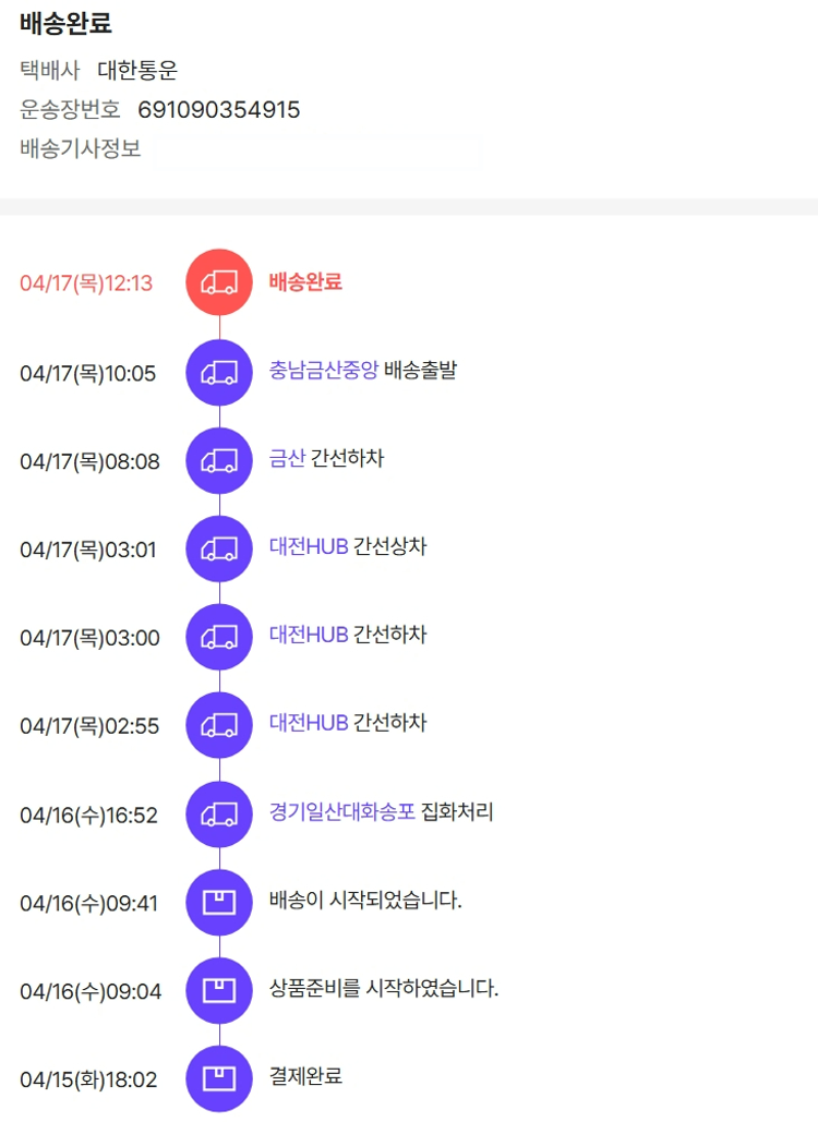 기부자님이 사용한 기부포인트 12,000원, 100원 미만 지원금 60원, 결제 수수료 4,512원, 기타 사업비는 행복나눔재단이 부담했습니다. (기부후기 발송시점에 최종 업데이트 됩니다.) 실제 쇼핑몰에서 확인되는 배송현황을 캡처한 내용입니다. 실시간 자료와는 차이가 있을 수 있습니다.
