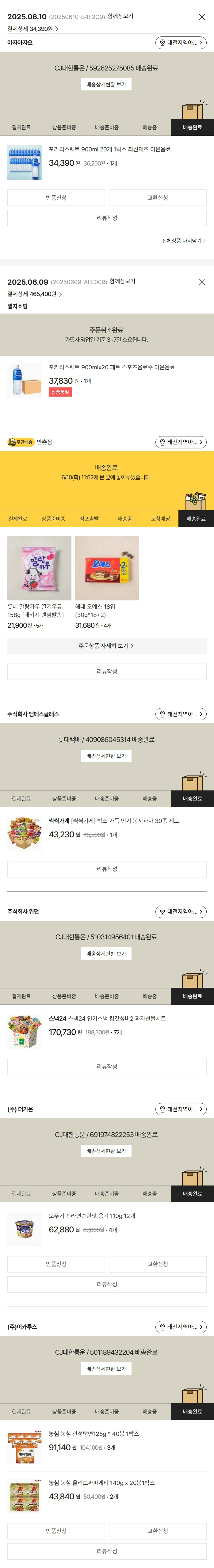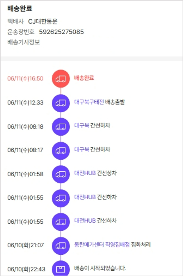 가격상승분 7,430원, 100원 미만 지원금 60원, 결제 수수료 11,222원, 기타 사업비는 행복나눔재단이 부담했습니다. (기부후기 발송시점에 최종 업데이트 됩니다.) 상품 주문 건 중 품절 발생하여 2025-06-10 재주문하였습니다. 실제 쇼핑몰에서 확인되는 배송현황을 캡처한 내용입니다. 실시간 자료와는 차이가 있을 수 있습니다.