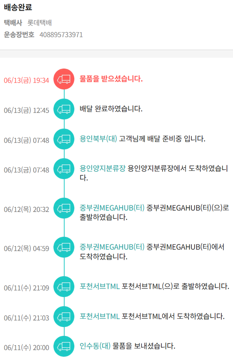 기부자님이 사용한 기부포인트 3,000원, 물품배송비 6,000원, 가격상승분 875원, 100원 미만 지원금 35원, 결제 수수료 10,841원, 기타 사업비는 행복나눔재단이 부담했습니다. (기부후기 발송시점에 최종 업데이트 됩니다.) 실제 쇼핑몰에서 확인되는 배송현황을 캡처한 내용입니다. 실시간 자료와는 차이가 있을 수 있습니다.