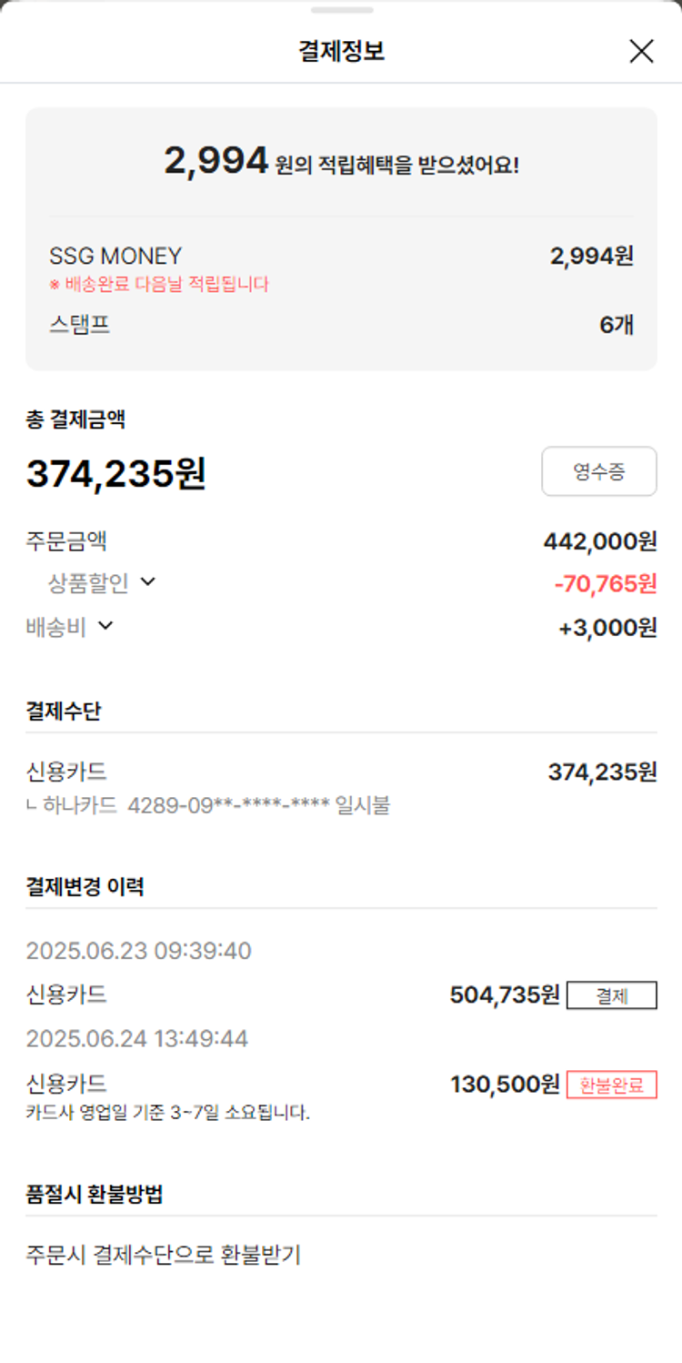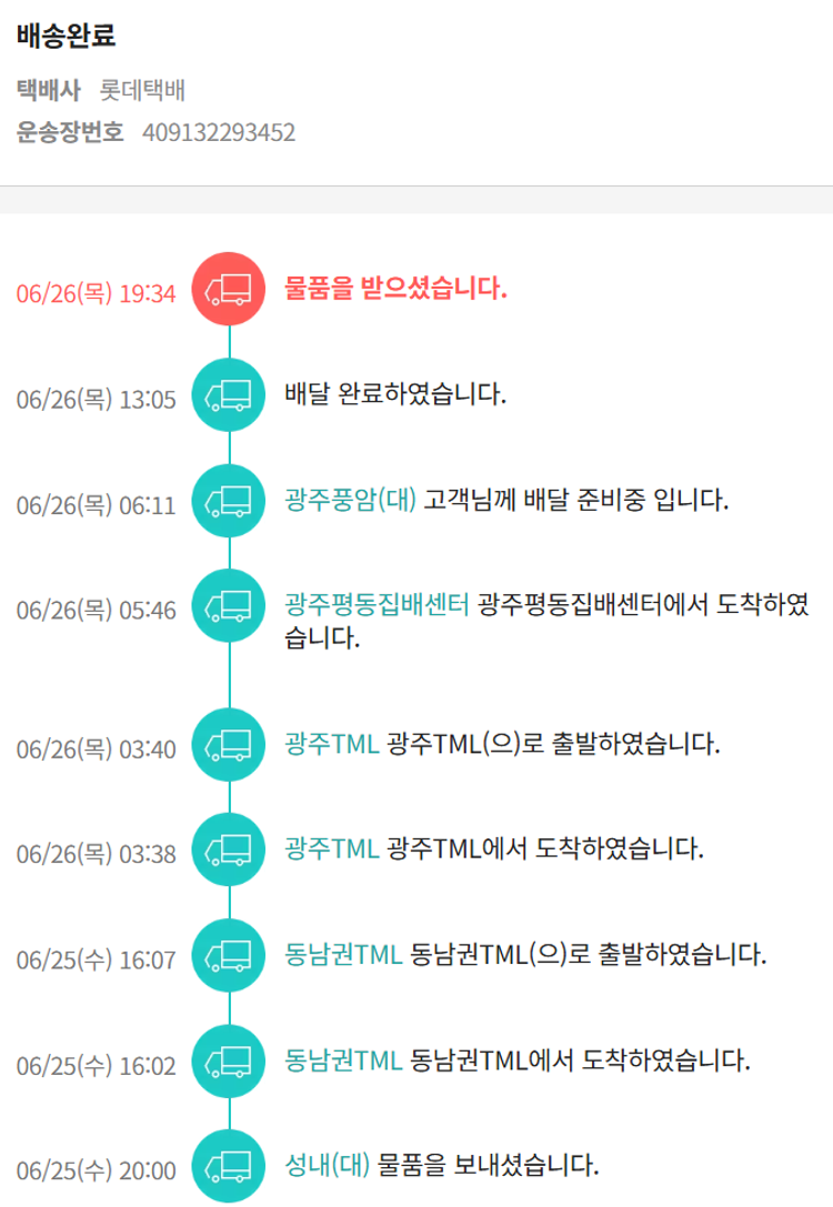 기부자님이 사용한 기부포인트 8,100원, 물품배송비 3,000원, 가격상승분 3,455원, 100원 미만 지원금 30원, 결제 수수료 10,851원, 기타 사업비는 행복나눔재단이 부담했습니다. (기부후기 발송시점에 최종 업데이트 됩니다.) 상품 주문 건 중 품절 발생하여 2025-06-24 재주문하였습니다. 실제 쇼핑몰에서 확인되는 배송현황을 캡처한 내용입니다. 실시간 자료와는 차이가 있을 수 있습니다.