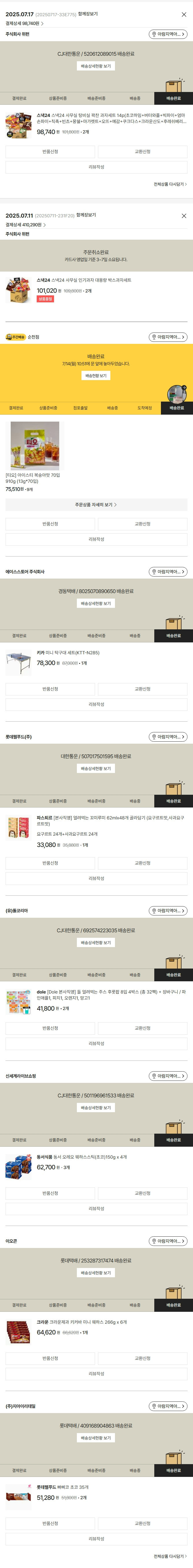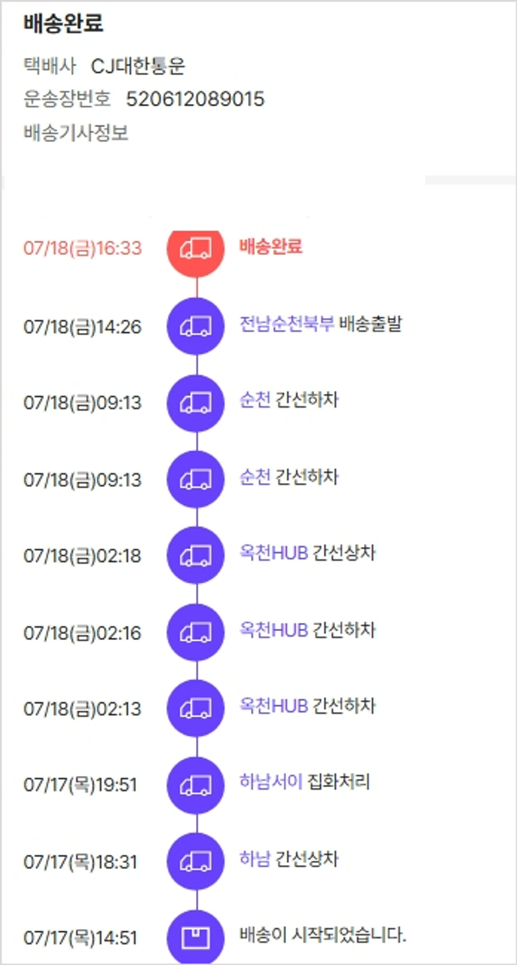 기부자님이 사용한 기부포인트 7,000원, 물품배송비 3,000원, 가격상승분 15,280원, 100원 미만 지원금 50원, 결제 수수료 10,593원, 기타 사업비는 행복나눔재단이 부담했습니다. (기부후기 발송시점에 최종 업데이트 됩니다.) 상품 주문 건 중 품절 발생하여 2025-07-17 재주문하였습니다. 실제 쇼핑몰에서 확인되는 배송현황을 캡처한 내용입니다. 실시간 자료와는 차이가 있을 수 있습니다.