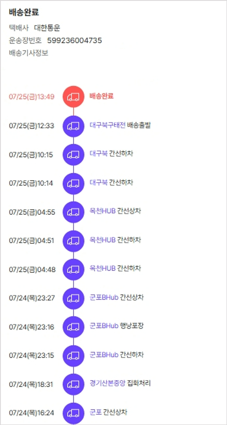 기부자님이 사용한 기부포인트 18,450원, 물품배송비 6,000원, 가격상승분 4,910원, 100원 미만 지원금 75원, 결제 수수료 10,793원, 기타 사업비는 행복나눔재단이 부담했습니다. (기부후기 발송시점에 최종 업데이트 됩니다.) 상품 주문 건 중 품절 발생하여 2025-07-24 재주문하였습니다. 실제 쇼핑몰에서 확인되는 배송현황을 캡처한 내용입니다. 실시간 자료와는 차이가 있을 수 있습니다.