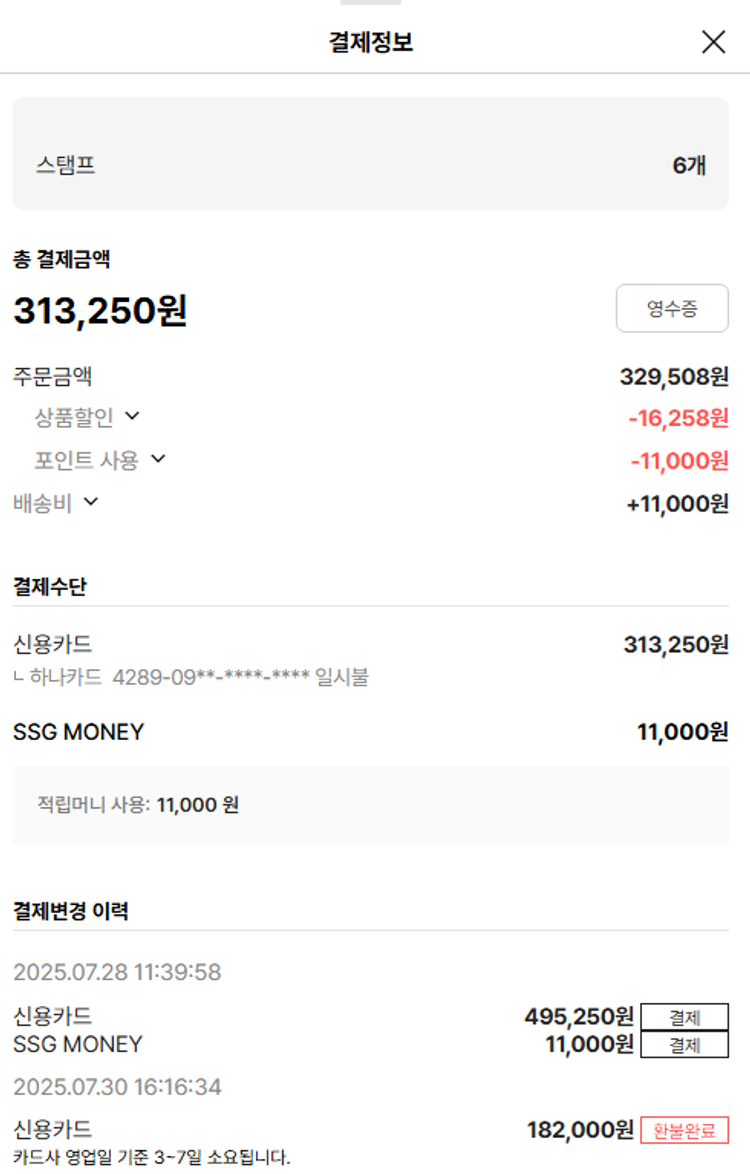 기부자님이 사용한 기부포인트 20,800원, 가격상승분 21,430원, 100원 미만 지원금 60원, SSG 머니 11,000포인트, 결제 수수료 11,590원, 기타 사업비는 행복나눔재단이 부담했습니다. (기부후기 발송시점에 최종 업데이트 됩니다.) 상품 주문 건 중 품절 발생하여 2025-08-05 재주문하였습니다. 실제 쇼핑몰에서 확인되는 배송현황을 캡처한 내용입니다. 실시간 자료와는 차이가 있을 수 있습니다.