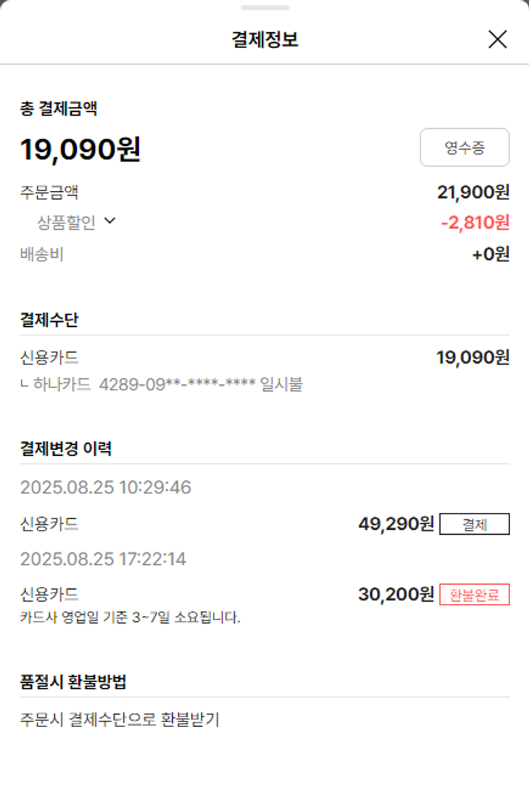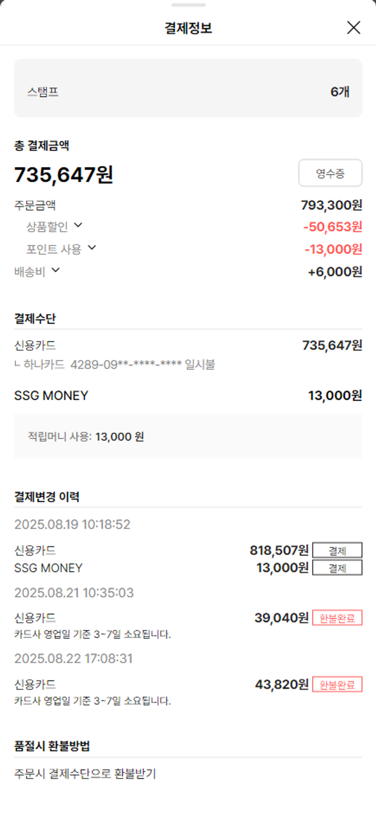 가격상승분 20,909원, 100원 미만 지원금 48원, SSG 머니 13,000포인트, 결제 수수료 17,916원, 기타 사업비는 행복나눔재단이 부담했습니다. (기부후기 발송시점에 최종 업데이트 됩니다.) 상품 주문 건 중 품절 발생하여 2025-08-27 재주문하였습니다. 실제 쇼핑몰에서 확인되는 배송현황을 캡처한 내용입니다. 실시간 자료와는 차이가 있을 수 있습니다.