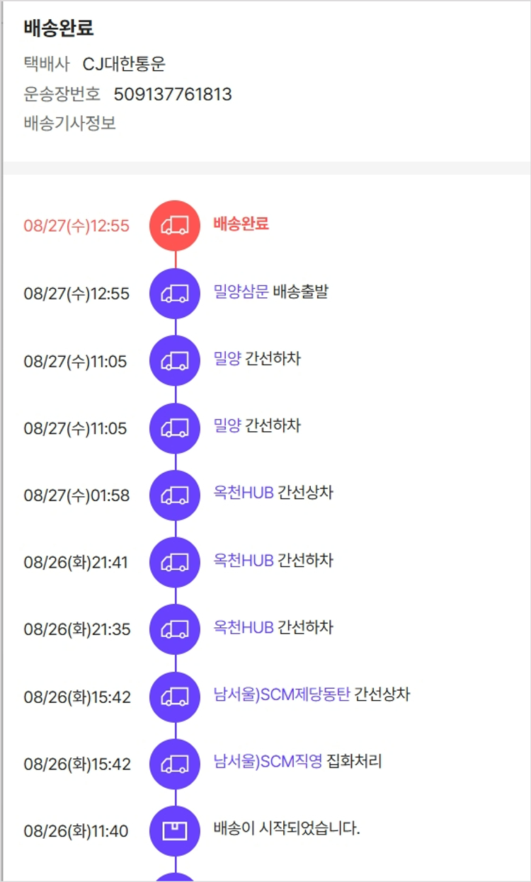 기부자님이 사용한 기부포인트 19,950원, 물품배송비 6,000원, 가격상승분 6,930원, 결제 수수료 11,079원, 기타 사업비는 행복나눔재단이 부담했습니다. (기부후기 발송시점에 최종 업데이트 됩니다.) 실제 쇼핑몰에서 확인되는 배송현황을 캡처한 내용입니다. 실시간 자료와는 차이가 있을 수 있습니다.